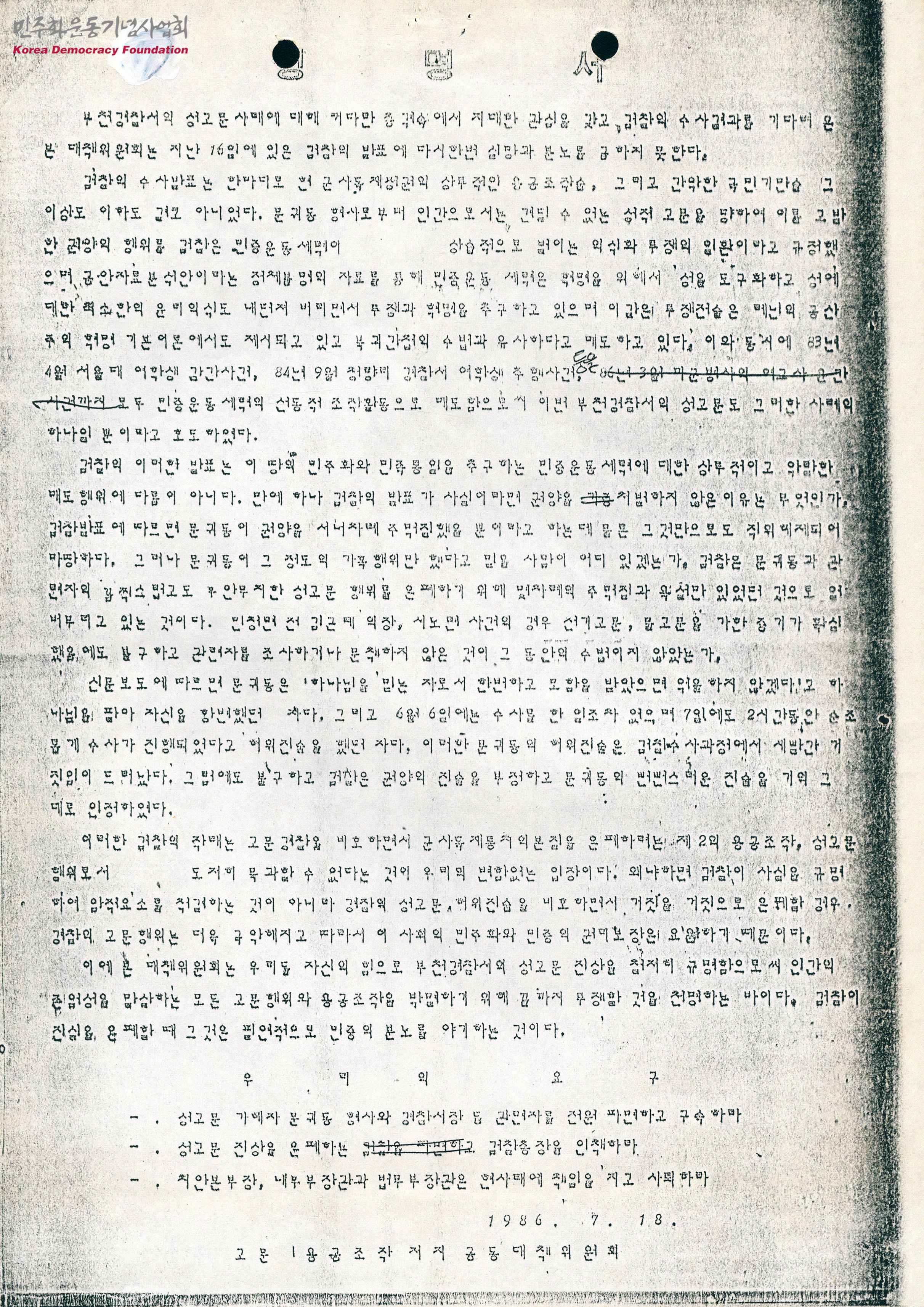 - 부천경찰서 성고문 사태에 대한 검찰의 수사 발표는 현 군사독재정권의 상투적인 용공조작술, 국민기만술에 지나지 않으며 검찰이 진실을 은폐하는 것은 민중의 분노를 야기하는 것이라고 적힌 문서로, 성고문 가해자 및 관련자를 전원 파면하고 구속하라, 성고문 진상을 은폐하는 검찰총장을 인책하라, 치안본부장, 내무부장관, 법무부장관은 현사태에 책임을 지고 사퇴하라 같은 요구사항이 적혀있음