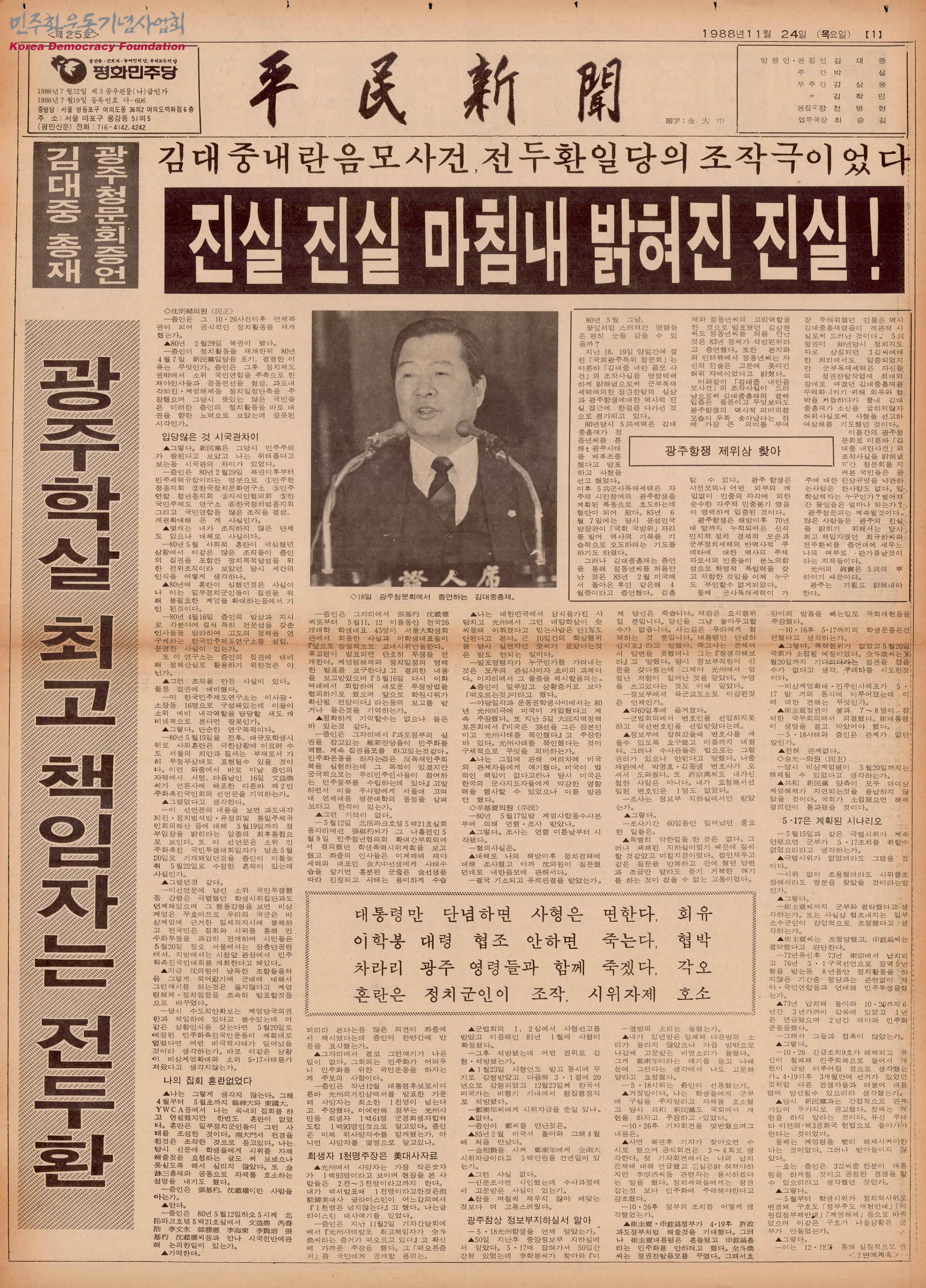 - 11월 18일 진행된 광주청문회에서 있었던 "김대중내란음모사건" 관련 김대중 총재의 증언과 고문으로 인해 김대중에게 돈을 받았다고 증언을 했다는 정동년의 인터뷰 등이 실려 있음