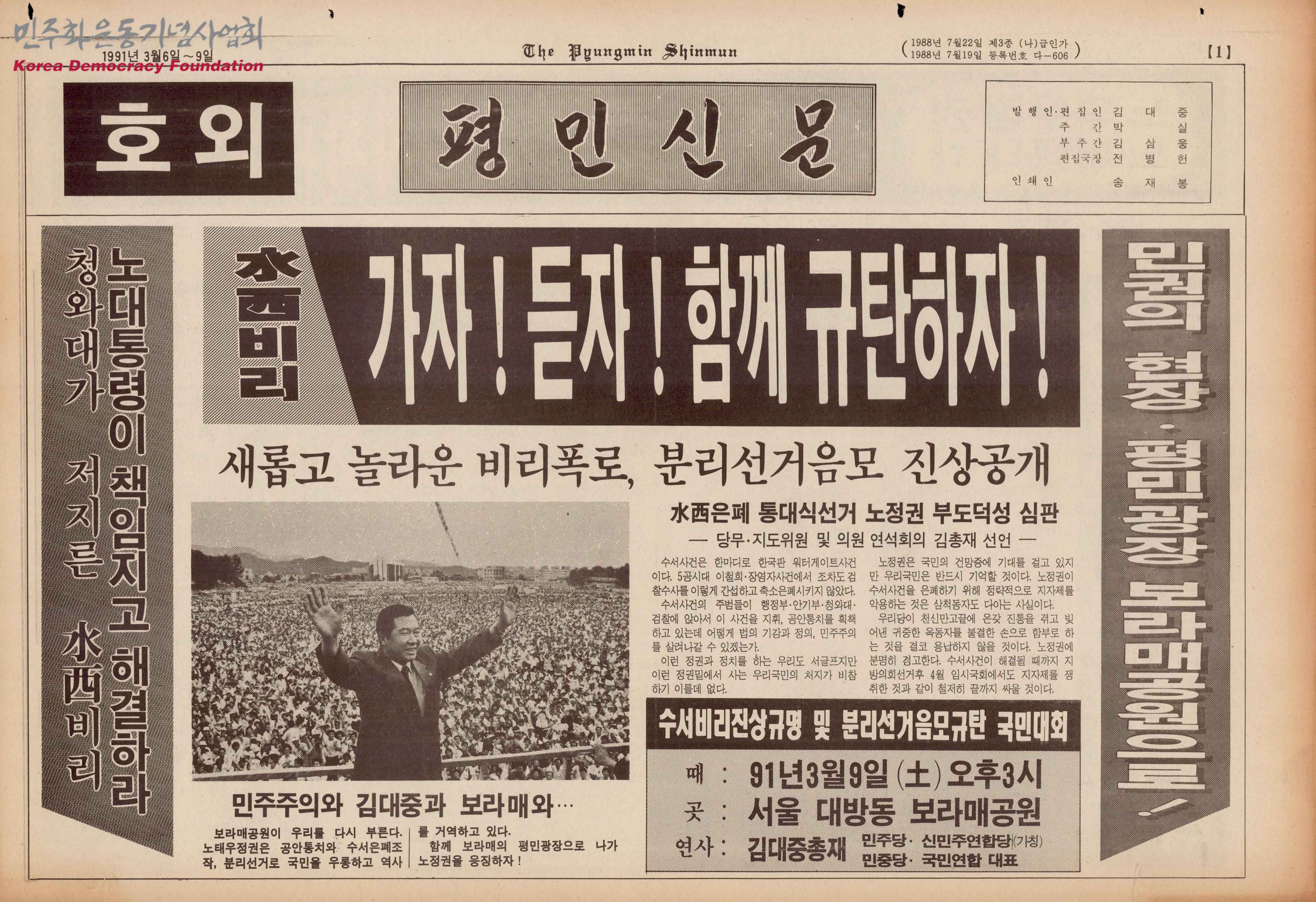 - 평화민주당의 기관지로 다음과 같은 내용이 수록됨 수서비리 가자! 듣자! 함께 규탄하자! 청와대가 저지른 수서비리 노대통령이 책임지고 해결하라 민권의 현장·평민광장 보라매공원으로! 노태우정권 노재봉내각 공안통치 포기하고 정치파괴 중단하라 평민의원 국회농성 결의 한보에 또 특혜 은행관리로 채무대리변제 법정관리로 채무장기동결