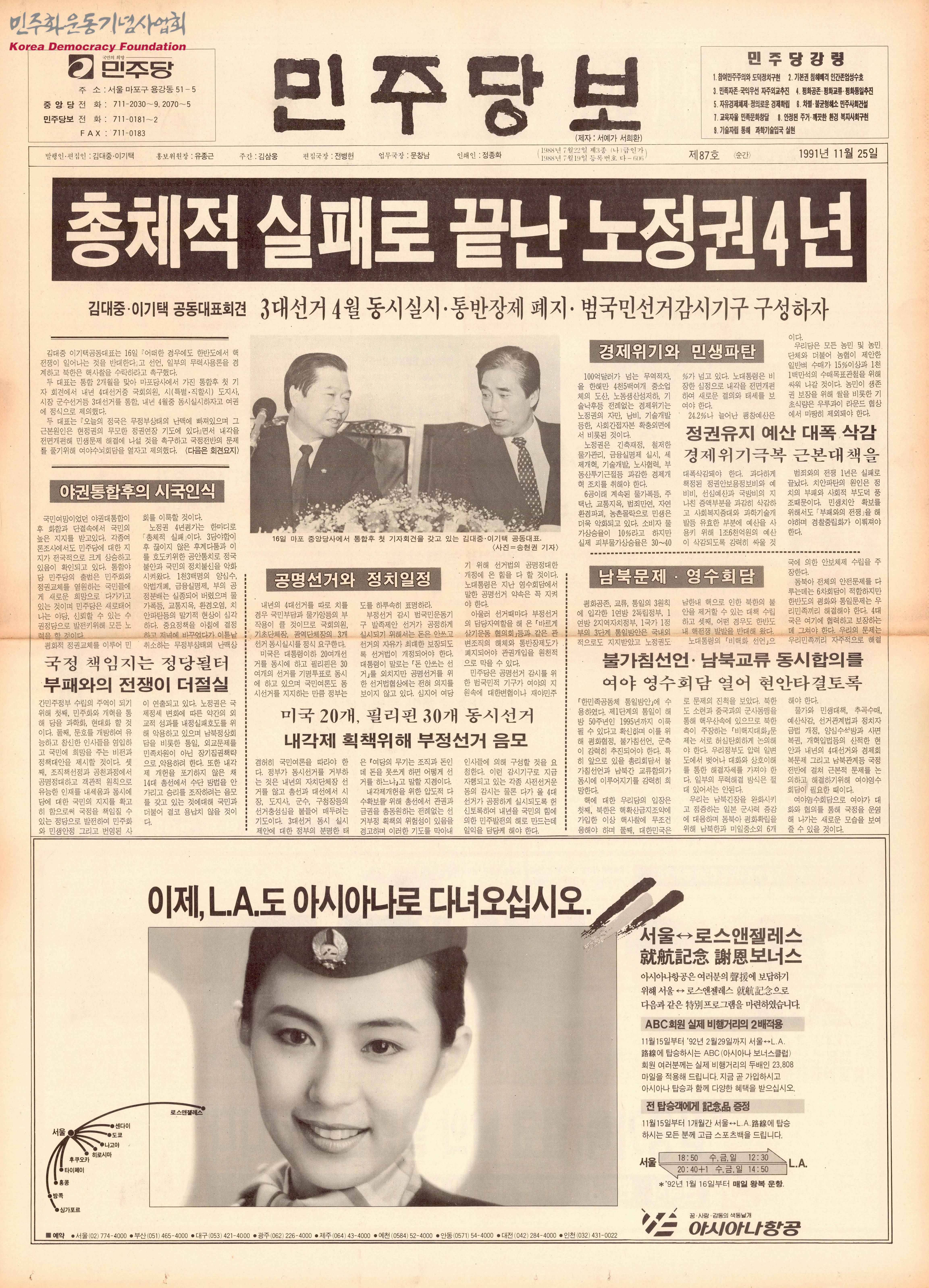 - 다음과 같은 내용이 수록됨 총체적 실패로 끝난 노정권 4년 김대중·이기택 공동대표회견 3대선거 4월 동시실시·통반장제 폐지·범국민선거감시기구 구성하자 국민은 불안하다 실종자 10만여명···민생치안 최악 물가 올라도 너무 올라 국민원성 못 듣는가 총선, 기초·광역단체장선거 동시실시 여론확산