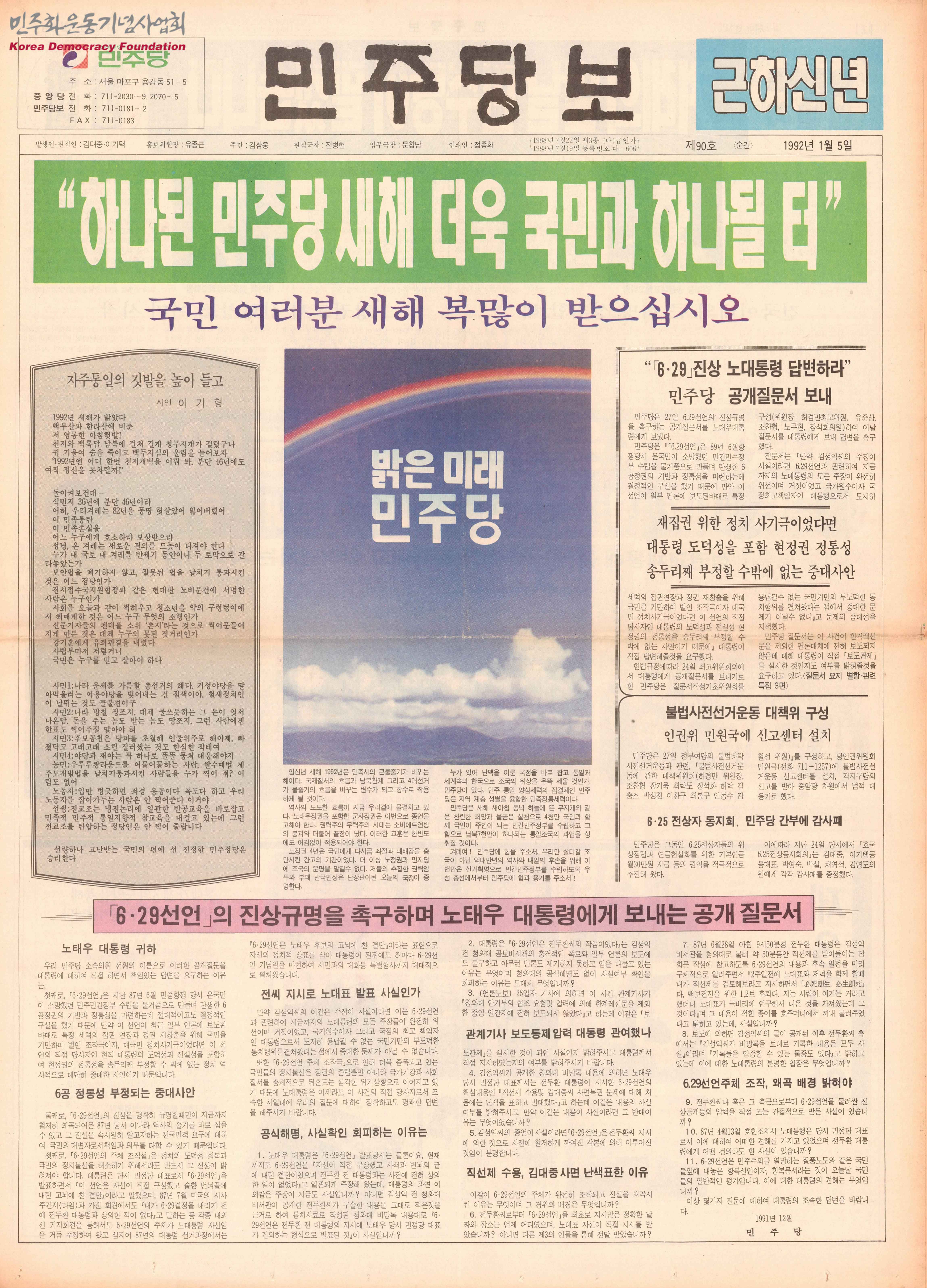- 다음과 같은 내용이 수록됨 "하나된 민주당 새해 더욱 국민과 하나될 터" 「6·29선언」의 진상규명을 촉구하며 노태우 대통령에게 보내는 공개 질문서 공동대표 신년사 겨레의 앞날 민주당이 맡겠습니다 "6·29는 속이구" 국민은 우롱당했다 노태우 대통령이 직접 진실 밝혀야 한다 「6공6신」 국민만 억울하다 잇딴 전철사고 민주당 대책마련