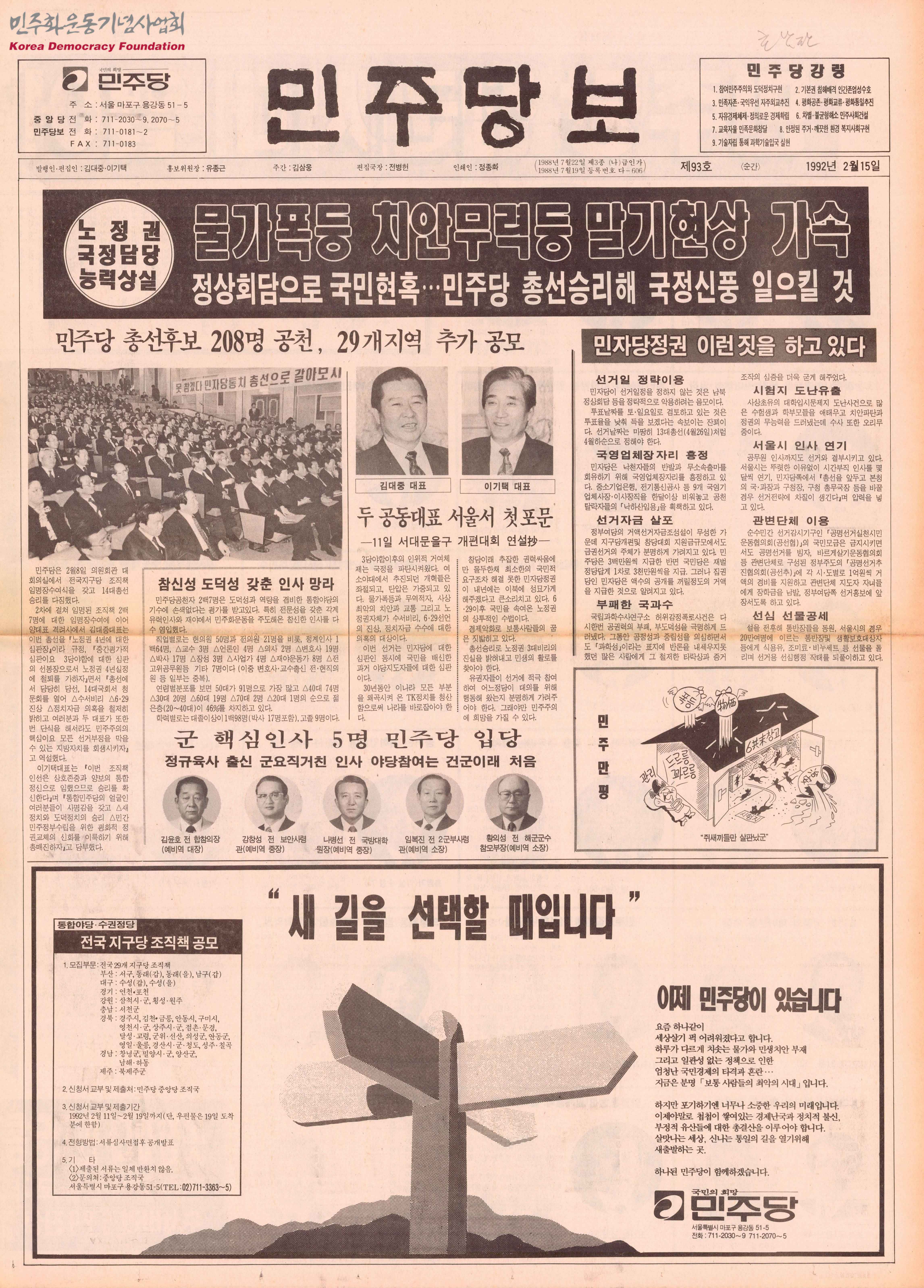 - 다음과 같은 내용이 수록됨 노정권 국정담당 능력상실 물가폭등 치안무력 등 말기현상 가속 정상회담으로 국민현혹··· 민주당 총선승리해 국정신풍 일으킬 것 군 핵심인사 5명 민주당 입당 민주당 집권시대 열어갈 정권교체 기수들 민주당이 자신있게 추천한 호남·제주 대변자! 민주자유당이 망친 경제 민주당이 살려낸다