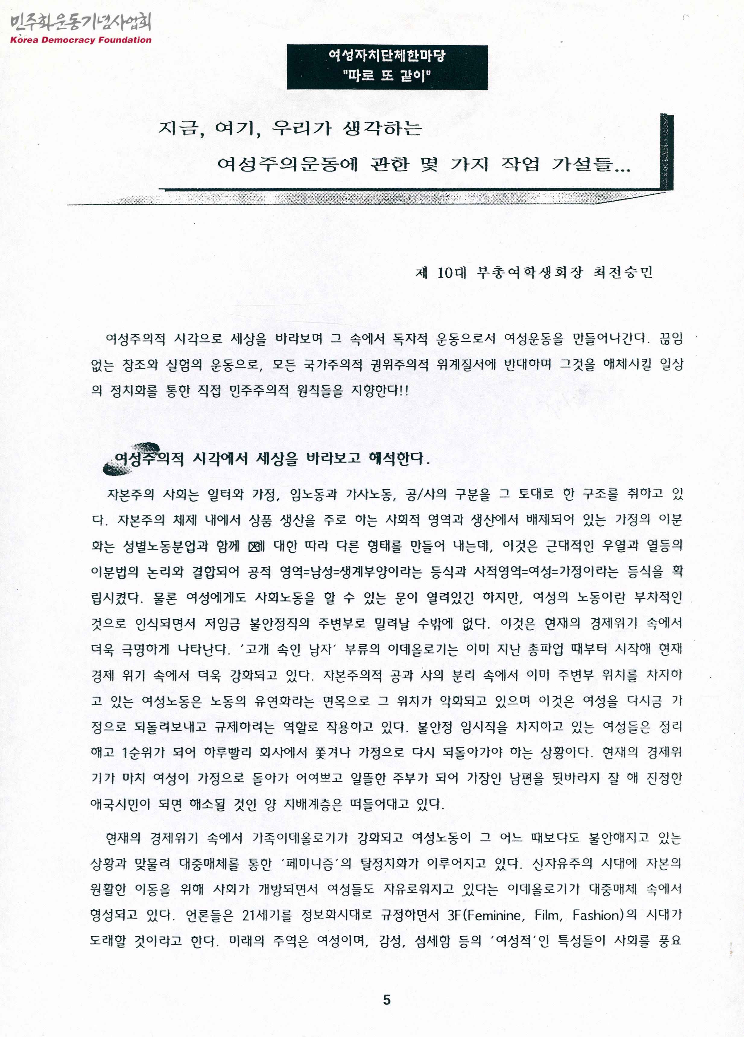 - 연세대 10대 총여학생회의 주최로 열린 <여성자치단체 한마당 "따로 또 같이">행사의 자료집에 실린 글로 아래와 같은 목차로 구성되어 있음 - 여성주의적 시각에서 세상을 바라보고 해석한다. - 하나의 독자적 운동으로서 여성운동을 지향한다. - 모든 국가주의적, 권위주의적 위계질서에 반대하며 일상의 정치 속에서 직접민주주의를 지향한다. - 운동은 끊임없는 실험과 창조의 과정이다.
