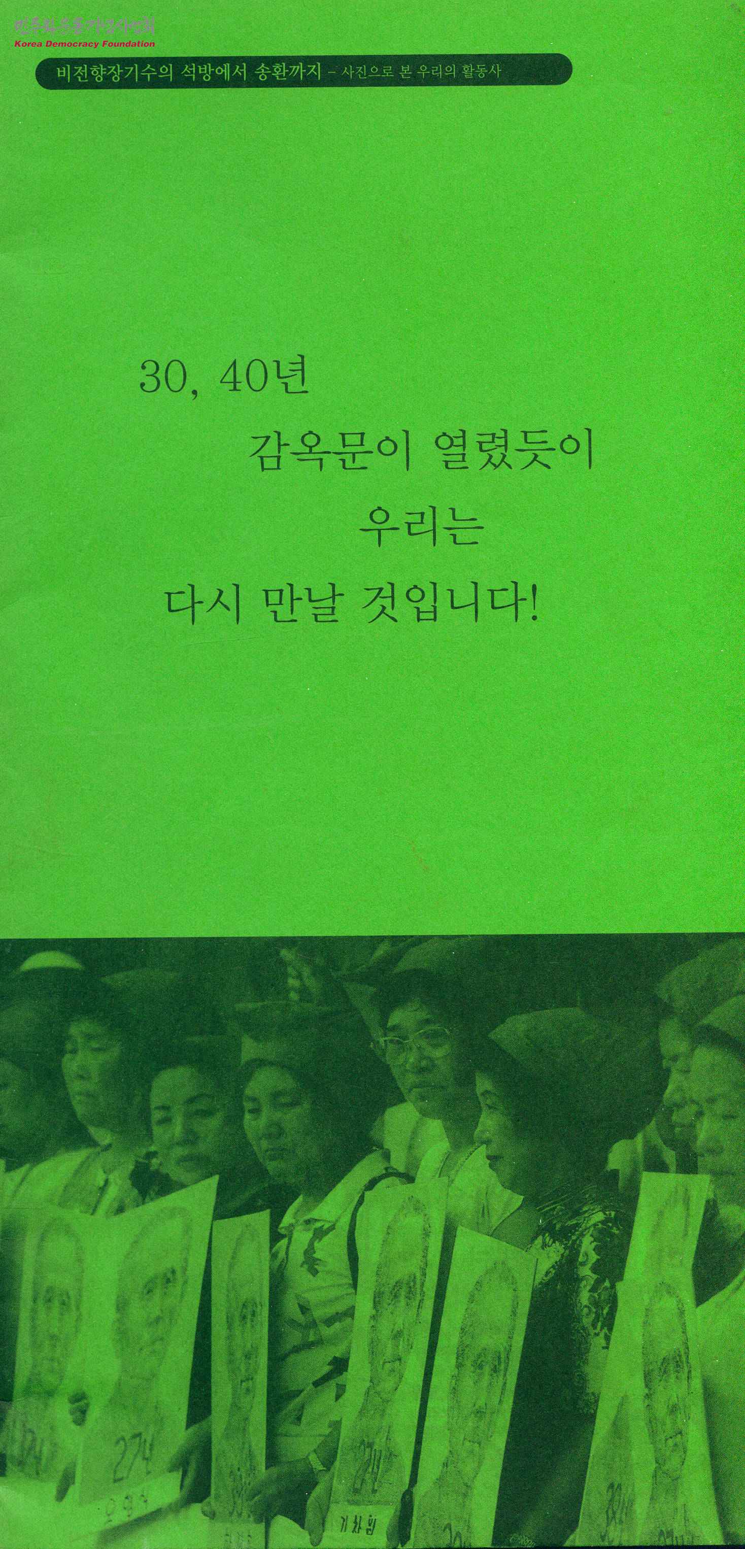 - 비전향장기수의 석방에서 송환까지의 활동을 다룬 책자로, 다음과 같은 내용이 수록됨 비전향장기수에 관한 소개 1. 사회안전법 피해자들, 세상으로 돌아오다 2. 암환자 왕영안을 석방하라! 3. 92년, "세계최장기수의 나라"임이 언론에 알려져 4. '갇힘의 시위', 하루감옥 체험 5. 보랏빛 수건을 쓴 어머니들의 고난의 행진, 목요집회 6. 마지막 장기수가 석방될 때까지 7. "어머니와 아들은 만나야 한다" 8. 아, 그렇게 외쳤건만··· 9. 준법서약에 가로막힌 석방의 길 10. "신념을 지켜온 사람들은 한국인의 자랑" 11. 아주작은 인권 만화전 12. 마침내 국제사회의 관심을 끌어내다 13. 양심수를 위한 시와 노래의 밤 14. 비전향장기수의 벗, 양심수후원회 15. 비전향장기수 송환으로 통일의 물꼬를 16. 우리 다시 만나리