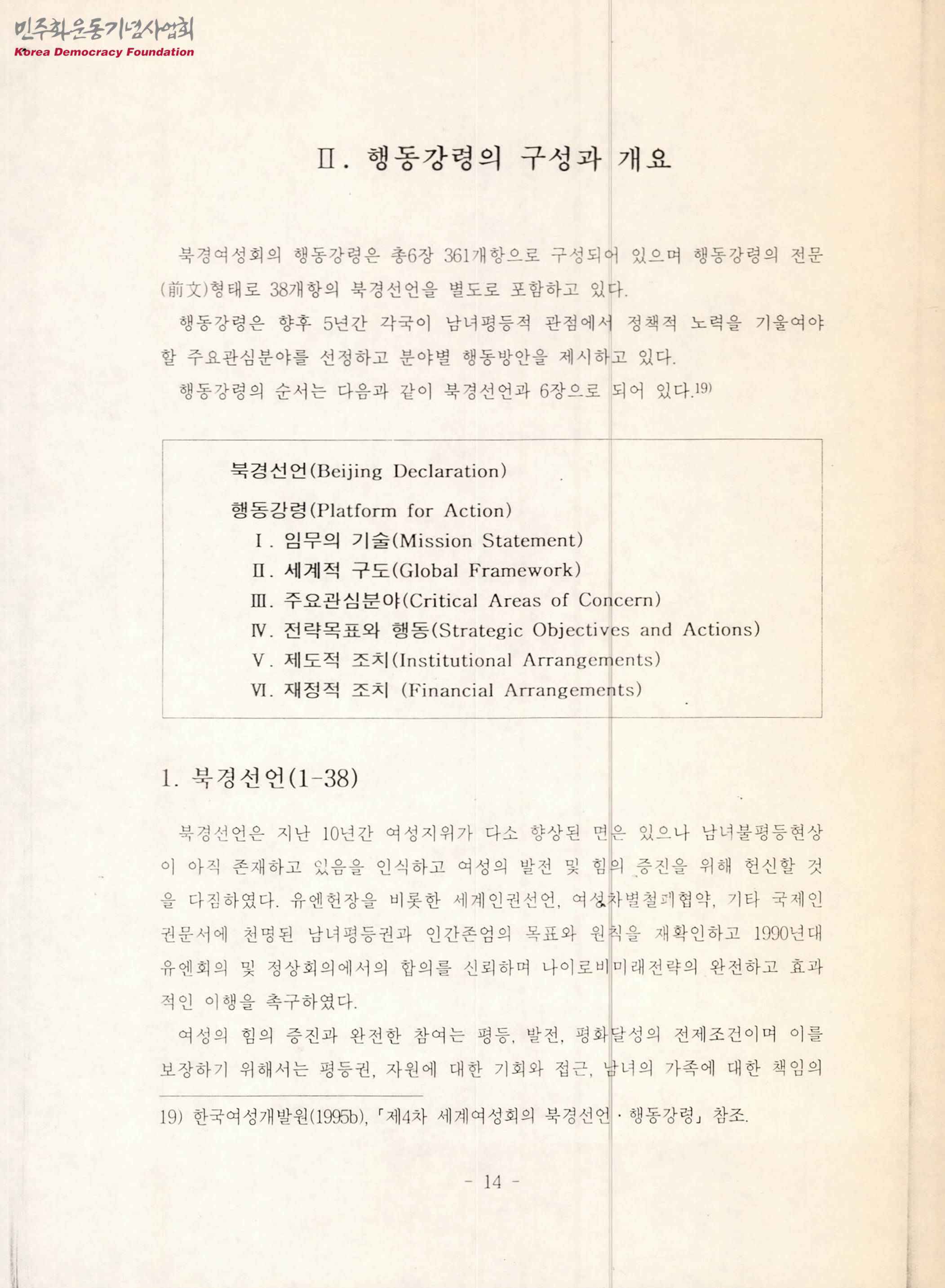 - 북경여성회의 행동강령의 구성과 개요가 담긴 문서와 여성관련 정책과제를 표로 정리한 문서