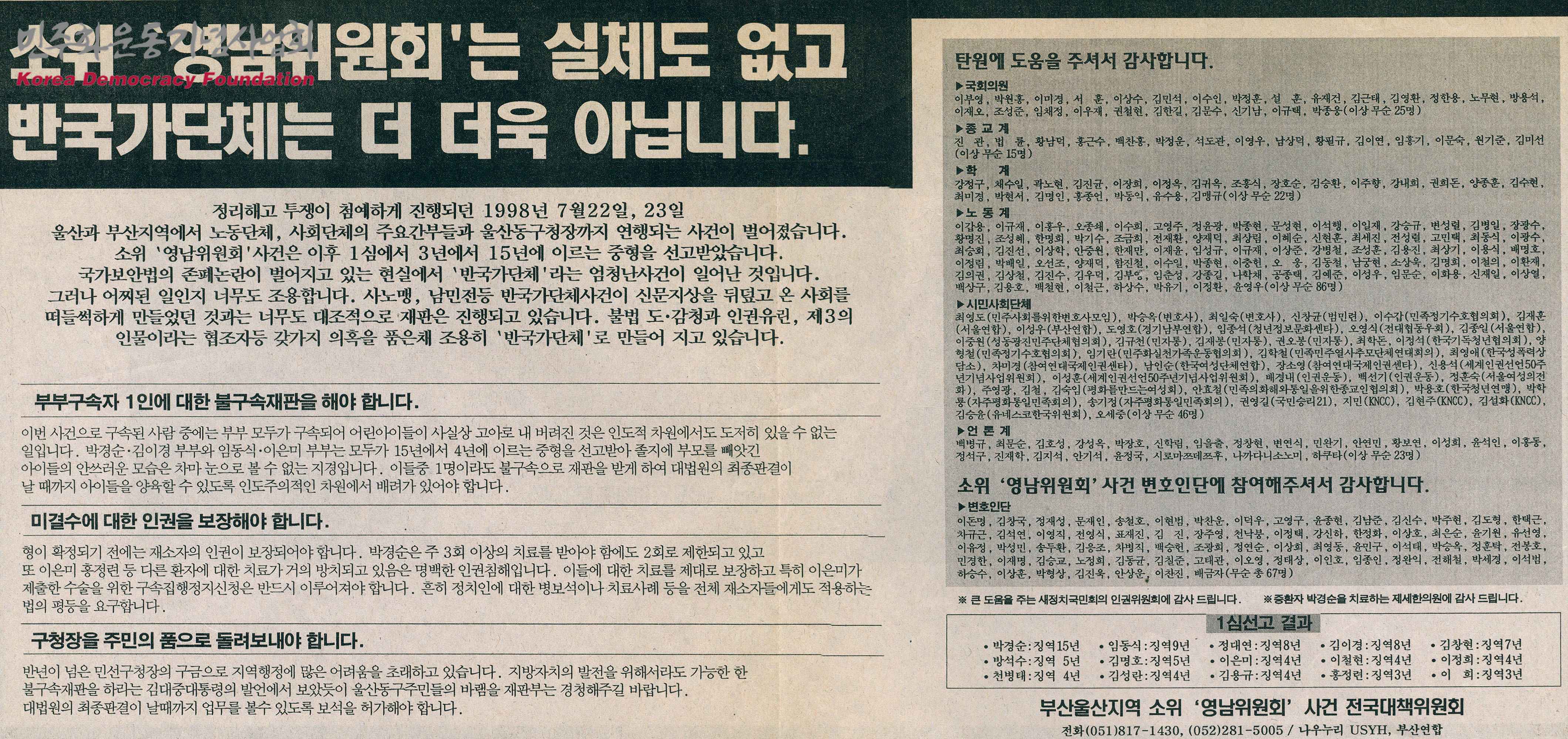 - 정리해고 투쟁 진행되던 1998년 7월 22, 23일, 울산·부산 지역의 노동·사회단체 주요간부와 울산동구청장이 연행된 '영남위원회' 사건을 알리는 유인물로 다음과 같은 내용이 수록됨 부부구속자 1인에 대한 불구속재판을 해야 합니다. 미결수에 대한 인권을 보장해야 합니다. 구청장을 주민의 품으로 돌려보내야 합니다. 탄원에 도움을 주셔서 감사합니다. 1심선고 결과