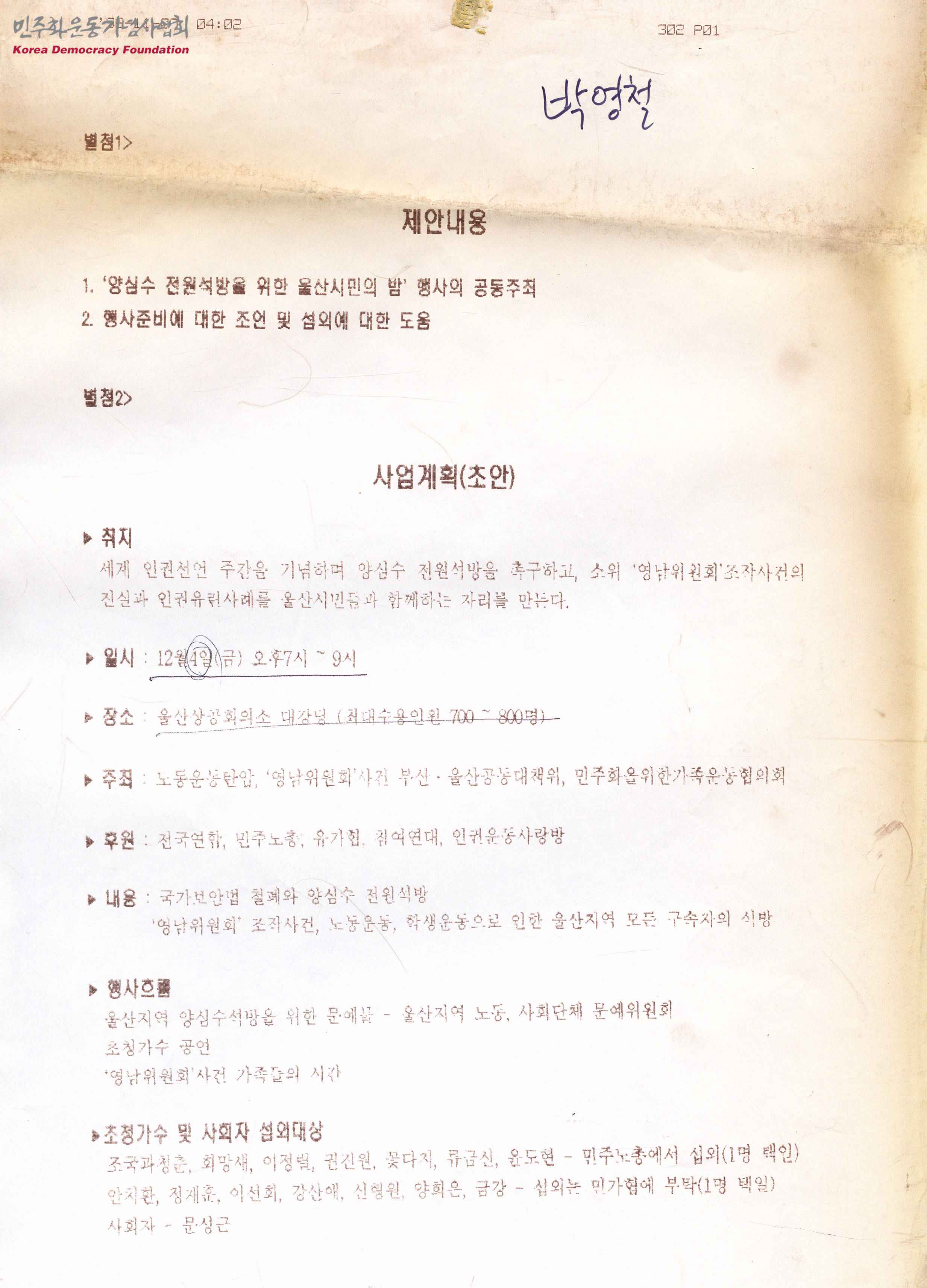 - 영남위원회 사건 구속자 등 울산지역 양심수 석방 촉구 문화행사, '양심수 전원석방을 위한 울산시민의 밤' 준비를 '민주화를 위한 가족운동협의회'에 요청하는 내용, 첨부된 제안내용과 사업계획(초안)