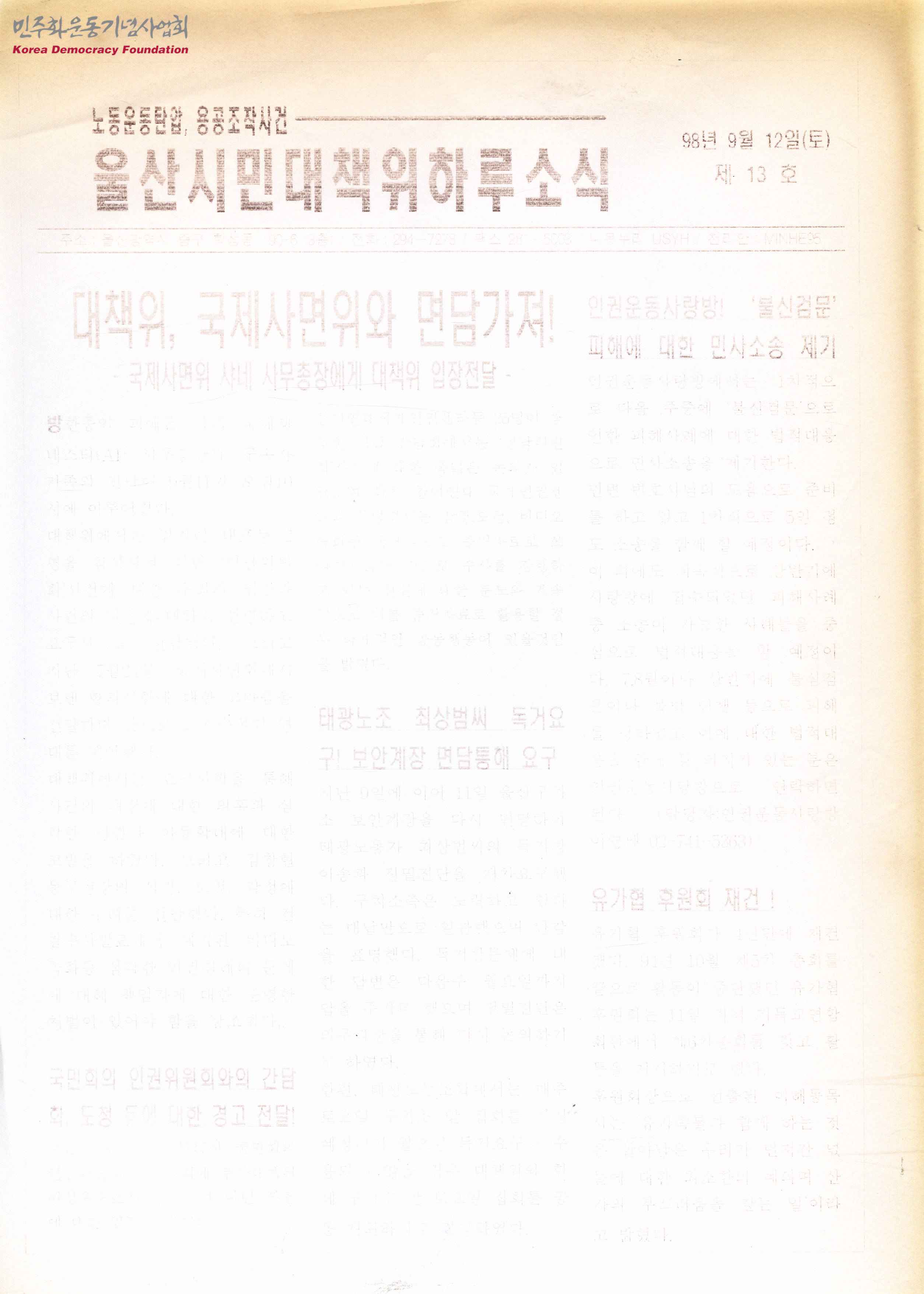 - 영남위원회 사건 진행을 알리는 소식지로, 다음과 같은 내용이 수록됨 대책위, 국제사면위와 면담가져! - 국제사면위 샤네 사무총장에게 대책위 입장전달 - 국민회의 인권위원회와의 간담회, 도청 등에 대한 경고 전달! 태광노조 최상범씨 독거요구! 보안계장 면담통해 요구 인권운동사랑방! '불신검문' 피해에 대한 민사소송 제기 유가협 후원회 재건!