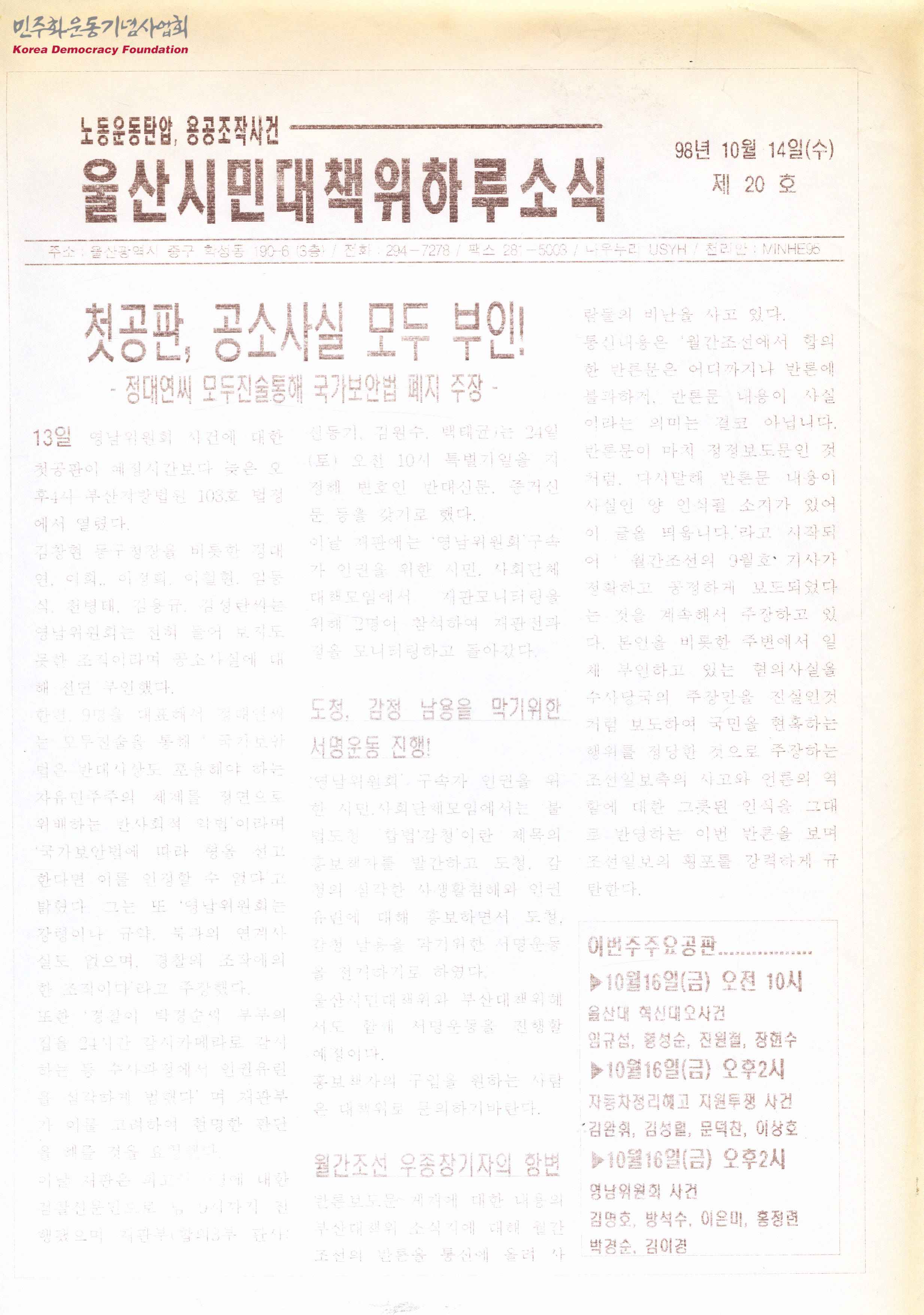 노동운동탄압, 용공조작사건 - 울산시민대책위하루소식 제20호