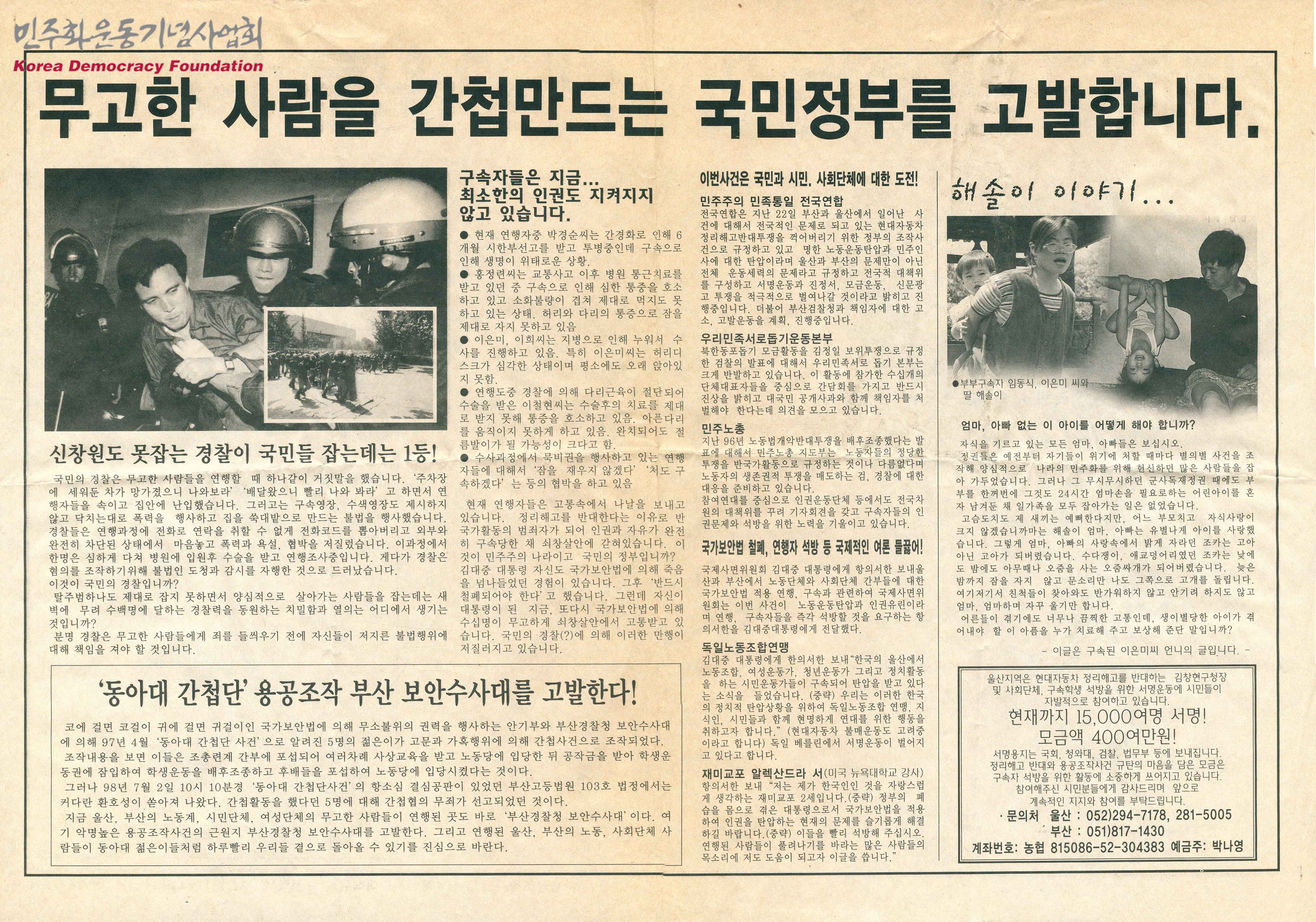 - 영남위원회 사건의 내용을 다루는 유인물로 다음과 같은 내용이 수록됨 정리해고 반대하는 것이 반국가활동이라니요? 용공조작에 대한 근거 구속자 명단 사건일지 무고한 사람을 간첩만드는 국민정부를 고발합니다. 신창원도 못잡는 경찰이 국민들 잡는데는 1등! '동아대 간첩단' 용공조작 부산 보안수사대를 고발한다! 구속자들은 지금… 최소한의 인권도 지켜지지 않고 있습니다. 이번사건은 국민과 시민, 사회단체에 대한 도전! 해솔이 이야기…