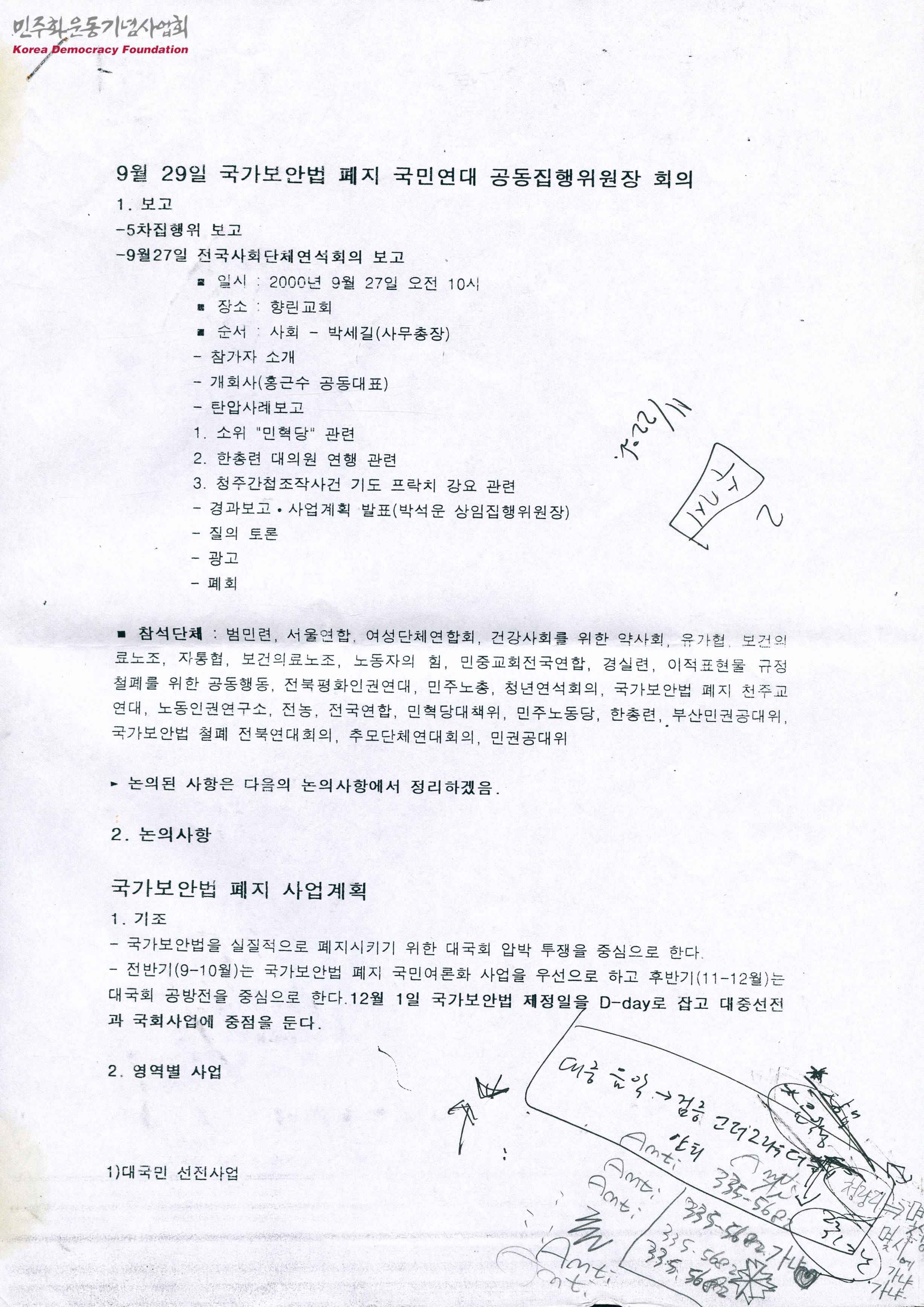 - 9월 29일자 국가보안법 폐지 국민연대 공동집행위원장 회의의 회의록으로 다음과 같은 내용이 수록됨 5차 집행위 보고 9월 27일 전국사회단체연석회의 보고 국가보안법 폐지 사업계획 국가보안법폐지 실천단 결성 9월 30일 '국가보안법 폐지 범국민행동의 날' 별첨 1) 국가보안법 폐지 국민연대 조직위 사업계획 별첨 2) 6.15 공동선언 역행하는 국가보안법 폐지하라! 별첨 3) 세계인권대회 기획(가안)