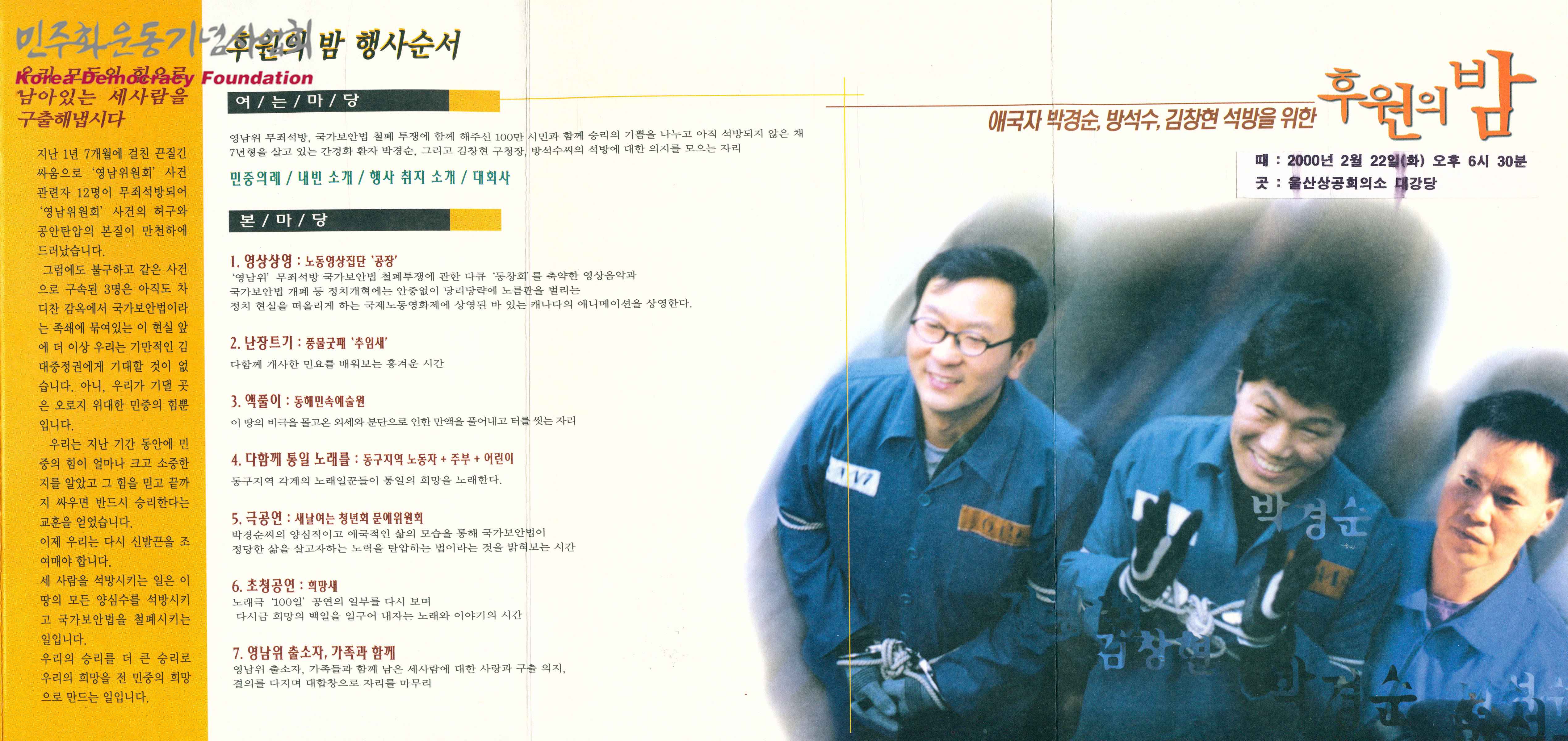 - 후원의 밤 행사 홍보 팸플릿으로, 행사의 일시, 장소, 식순, 내용, '영남위원회' 사건 일지, 미석방자 3명 이력 등의 내용이 수록됨