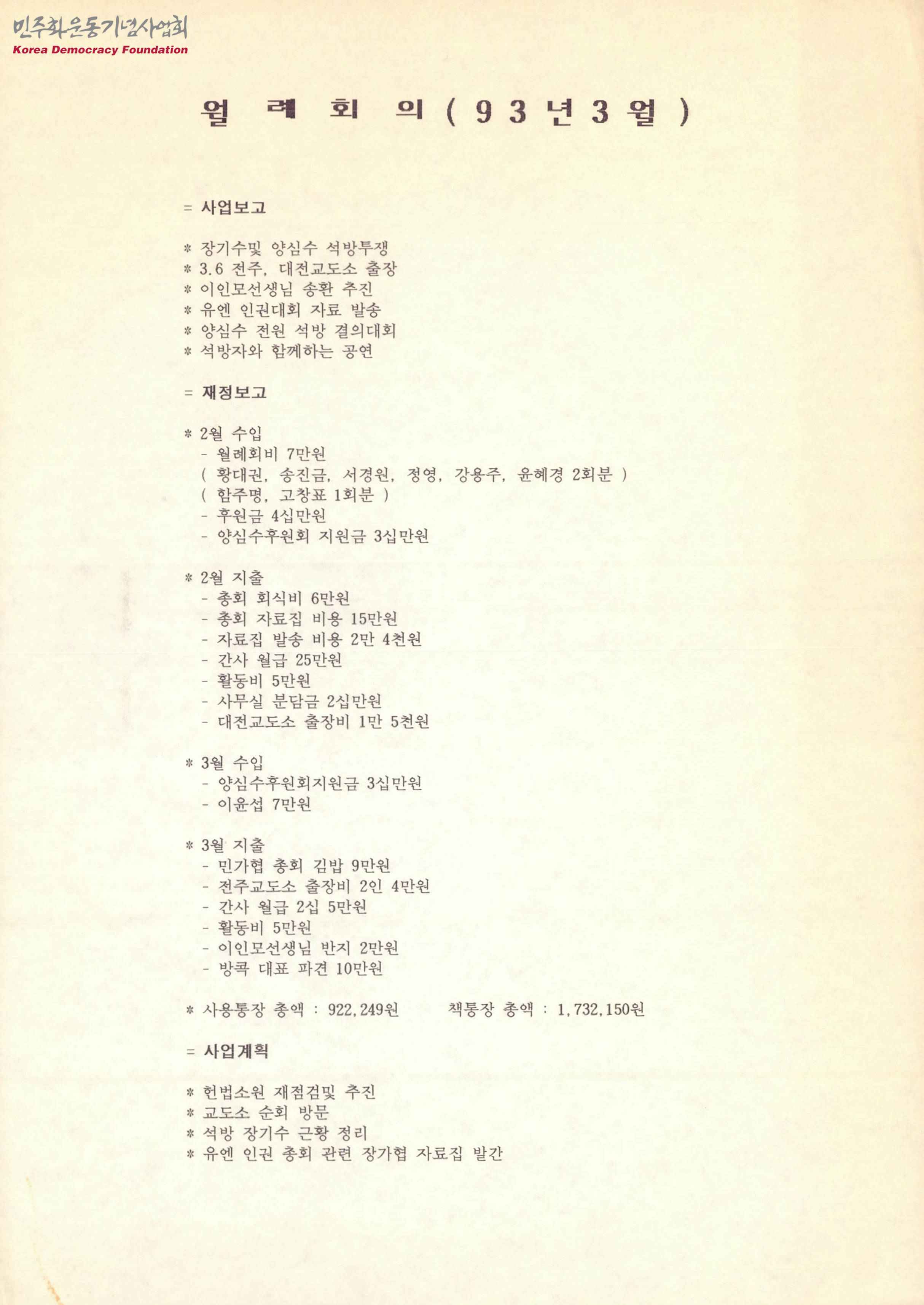 - 민주화실천가족운동협의회 장기수 가족 운동 협의회의 1993년 3월 월례회의 문서로 '사업보고', '재정보고', '사업계획' 등의 내용이 수록됨