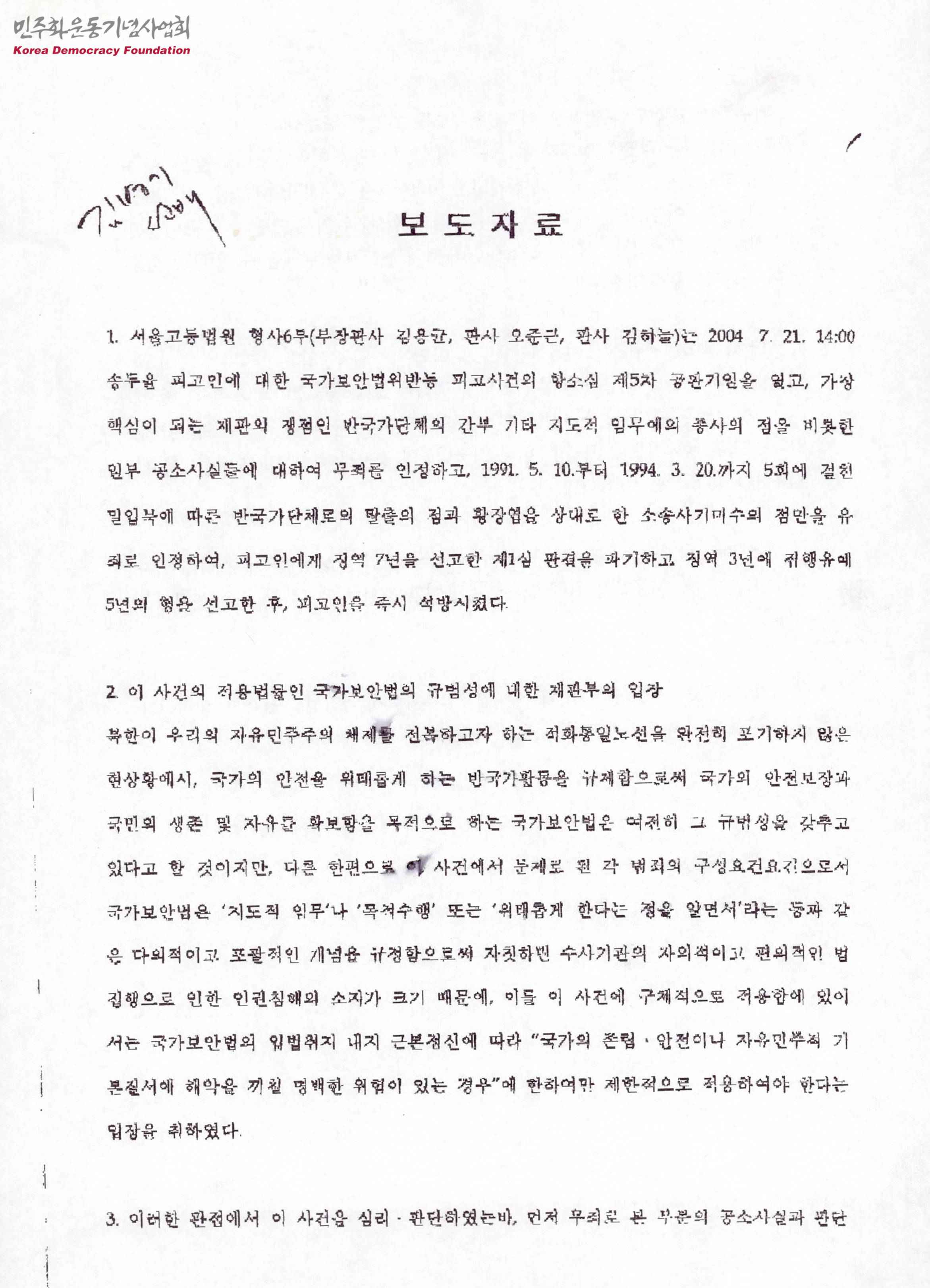 [송두율에 대한 항소심 보도자료]
