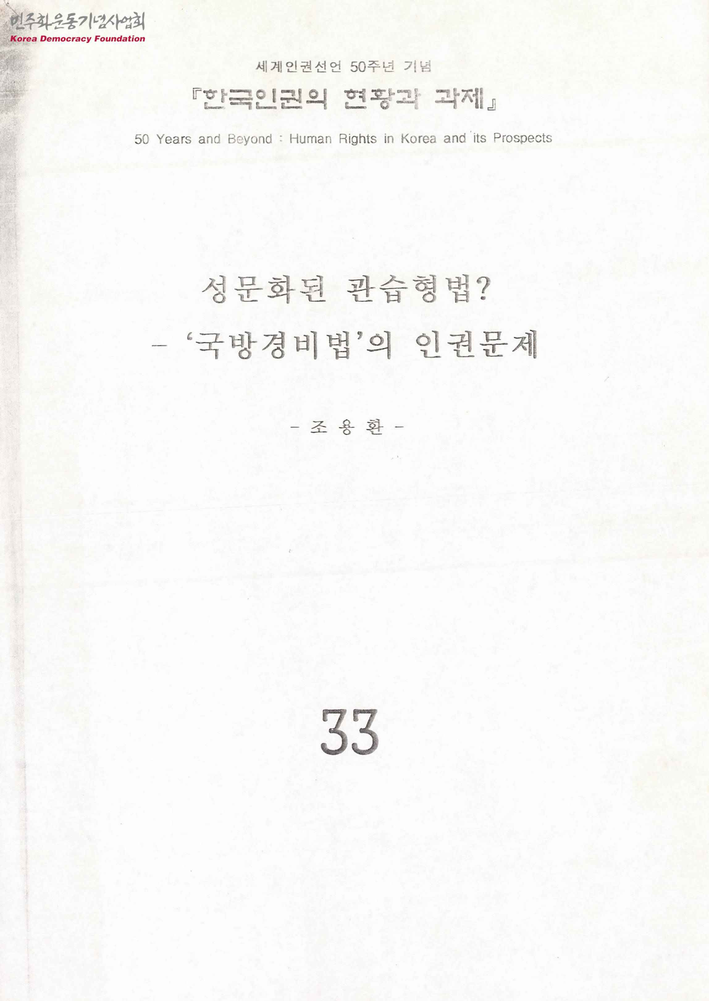 - 세계인권선언 50주년을 기념하여 조용환이 한국인권의 현황과 과제를 주제로 작성한 문서로 '국방경비법, 왜 문제인가', '미국정법령과 관보', '국방경비법, 법인가?', '국방경비법의 법형식상 모순' 등의 내용이 수록됨