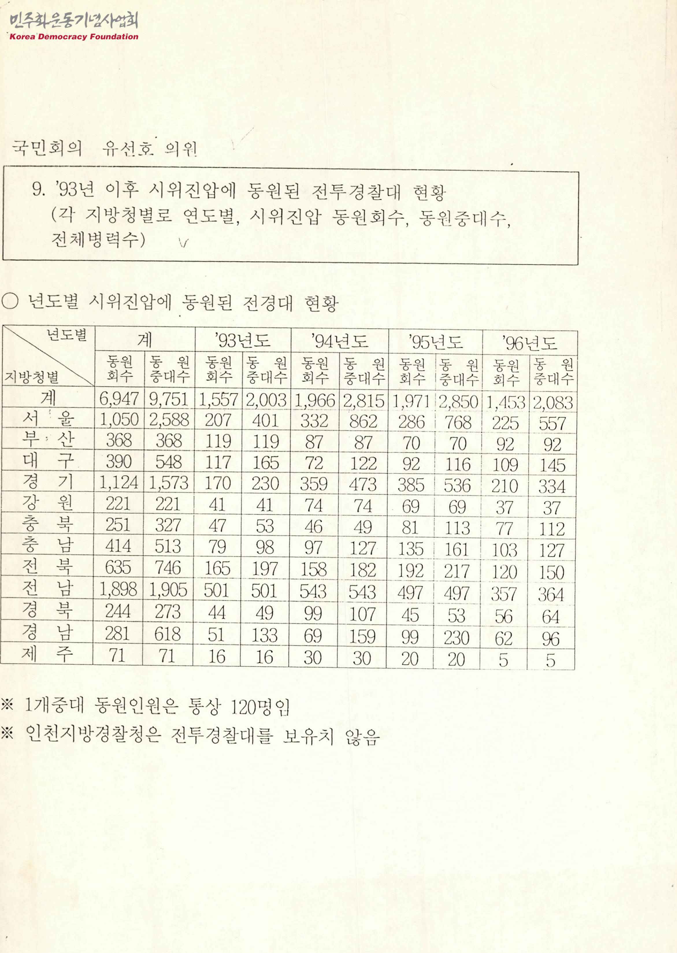 - 1993년 이후 시위진압에 동원된 전투경찰대 현황 중 1993년부터 1996년까지의 시위진압에 동원된 전경대 현황 통계자료로 '지역별 지방청', '년도별 동원회수 및 동원 중대수' 등의 내용이 수록됨