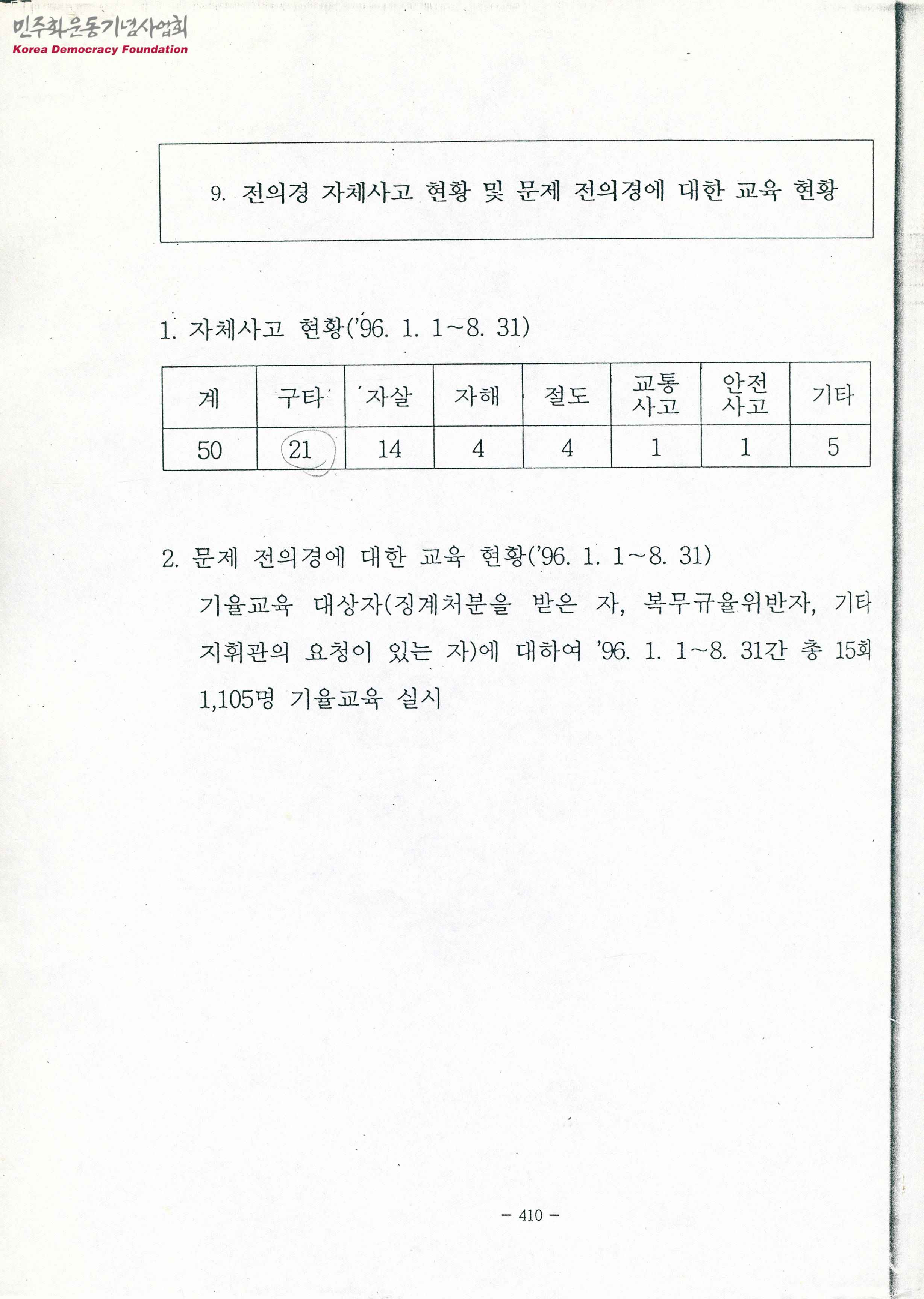 - 1996년 1월 1일부터 1996년 8월 31일까지 일어난 전경과 의경의 자체사고 현황 및 문제 전의경에 대한 교육 현황 문서로 50건의 자체사고 현황과 기율교육 대상자(징계처분 받은 자, 복무규율위반자, 기타 지휘관의 요청이 있는자)에 대한 총 15회 1,105명 기율교육 실시 등의 내용이 수록됨