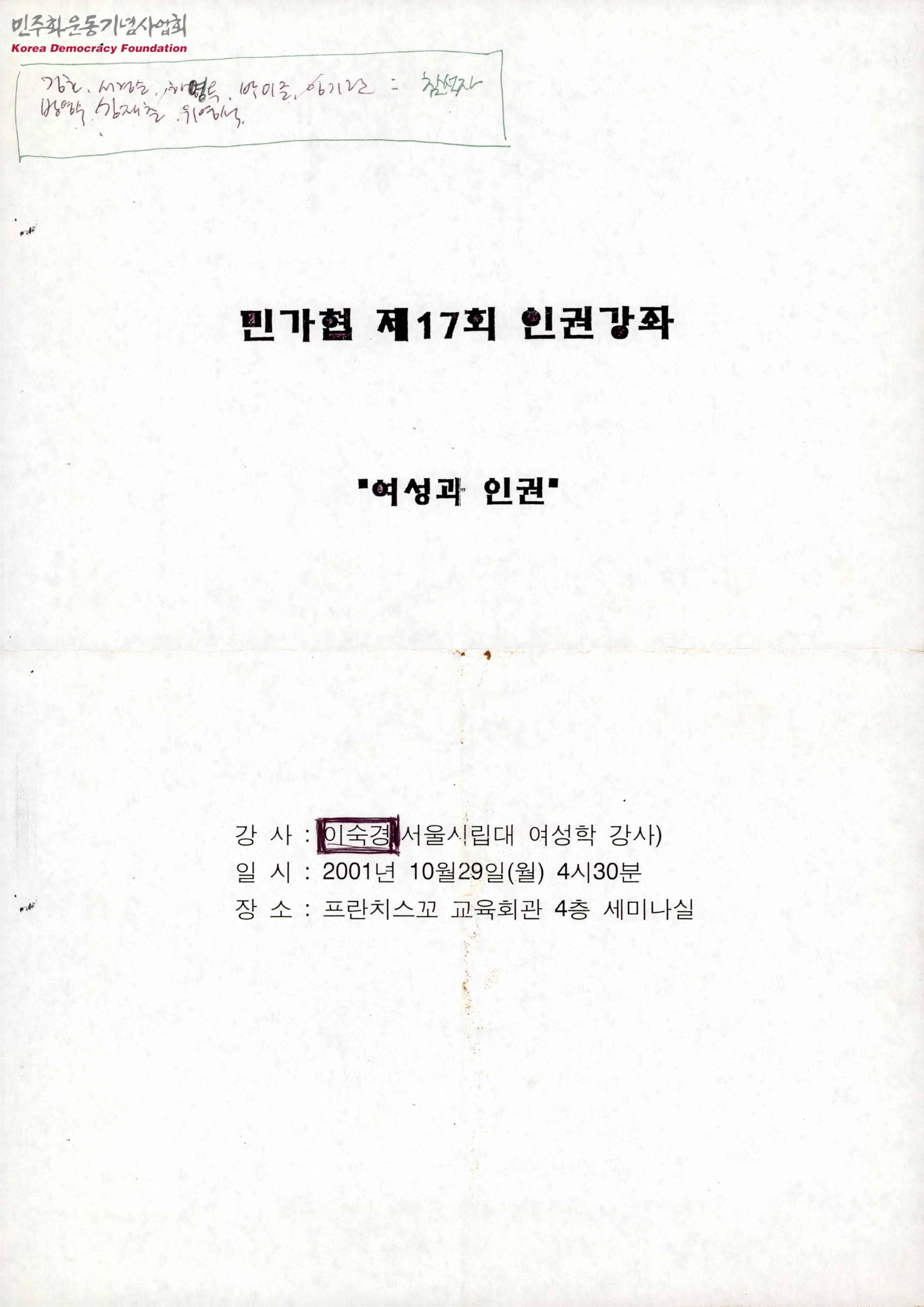 - 민주화실천가족운동협의회 제17회 인권강좌 자료집으로 아줌마 내공테스트라는 설문조사 문서, '여성과 인권'이라는 서울시립대 여성학 강사 이숙경의 글 등이 수록됨