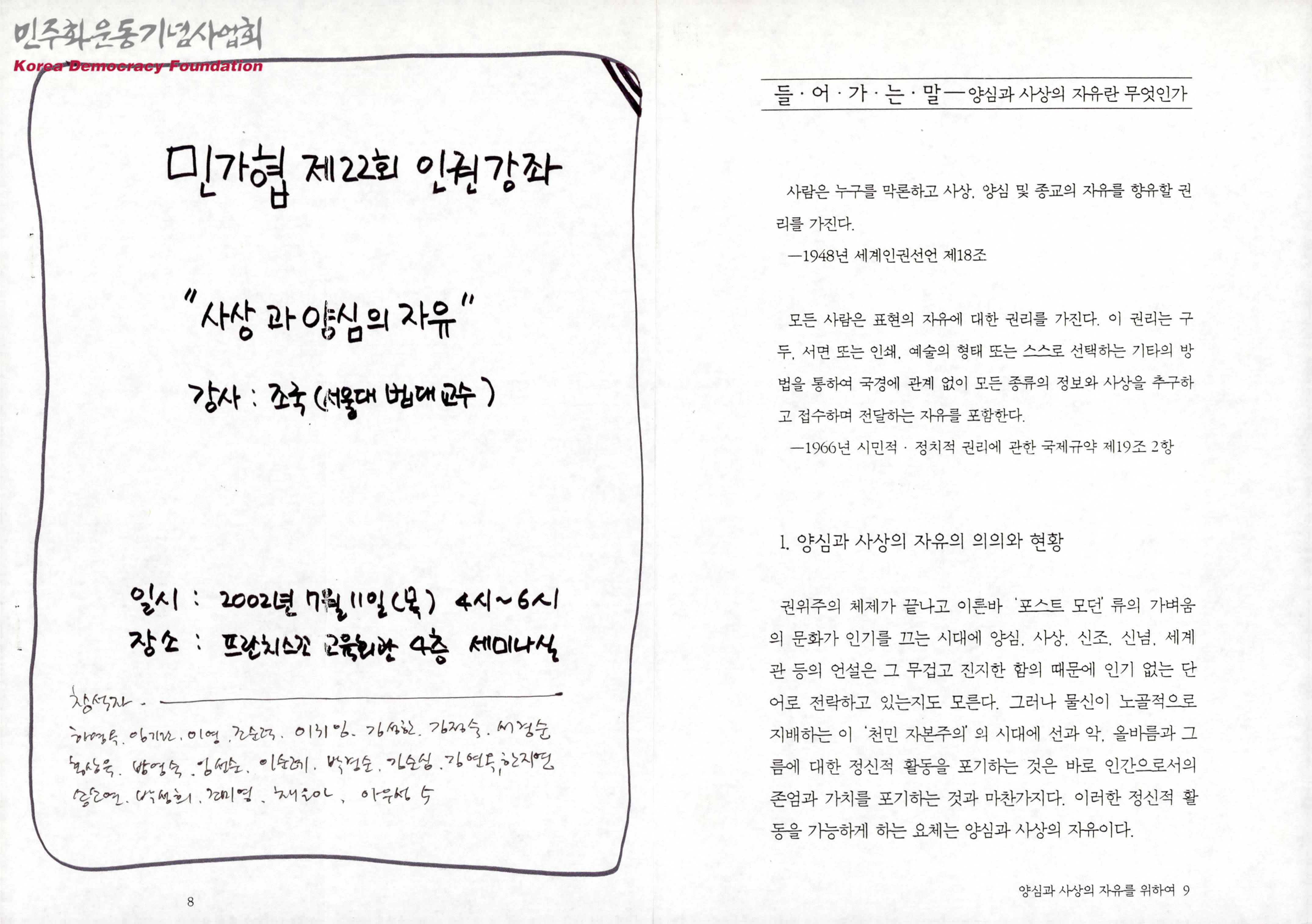 - 서울대 법대 교수 조국을 초청한 민주화실천가족운동협의회 제22회 인권강좌 자료집으로 목차는 다음과 같음 - 들어가는말 - 양심과 사상의 자유란 무엇인가 1. 양심과 사상의 자유의 의의와 현황 2. 양심과 사상의 자유의 구성 내용과 쟁점