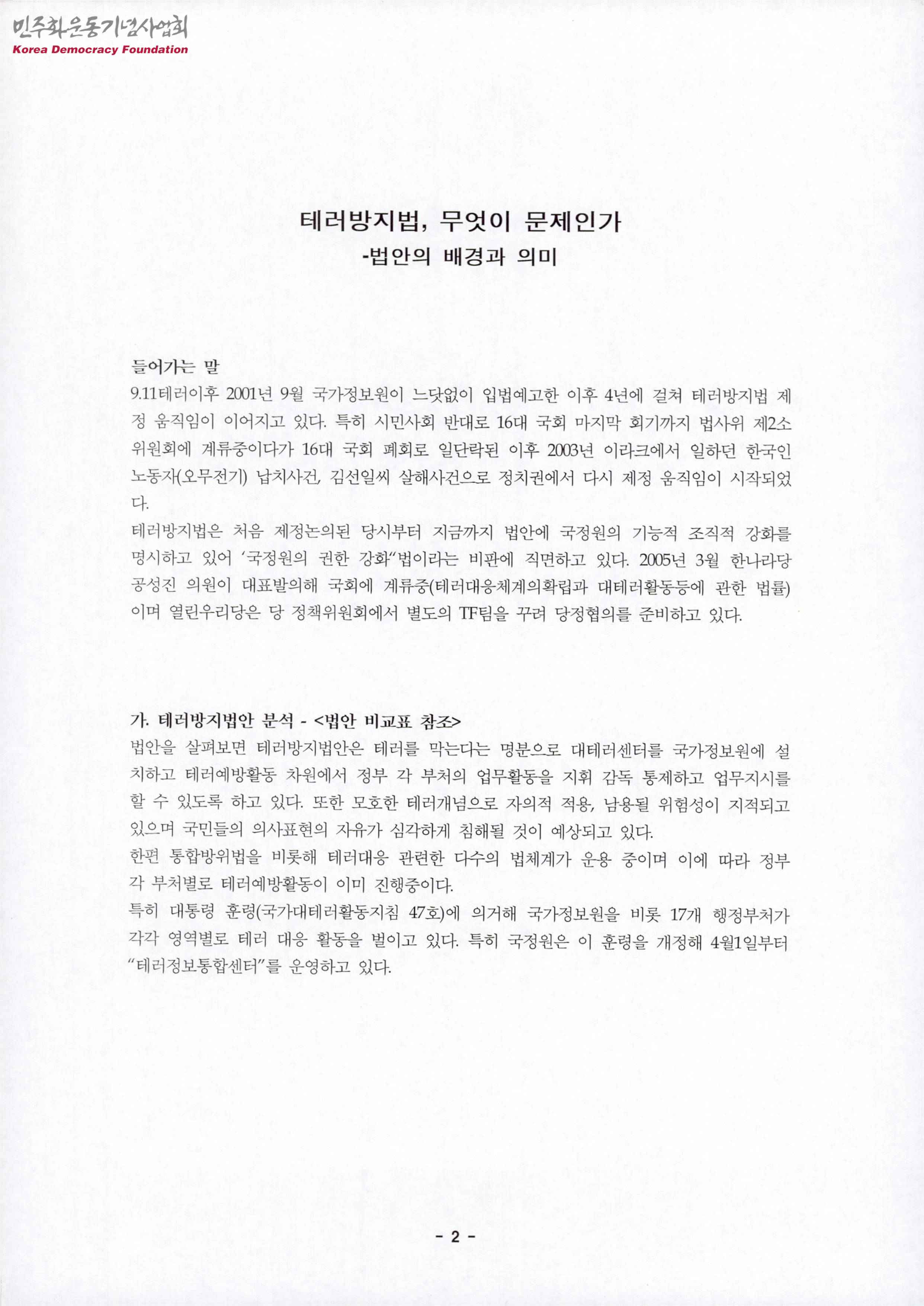 - 테러방지법의 문제에 대해 적은 문서로 법안 비교표와 테러대책기구 세분사항에 관련된 표가 첨부되어 있고 목차는 다음과 같음 - 들어가는 말 가. 테러방지법안 분석 나. 테러관련 국내법과 제도 다. 대통령 훈령 47호(국가대테러활동지침) 라. 정부 각 부처의 테러업무현황 마. 국제사회의 테러 대응 사. 테러방지법안 배경과 의미