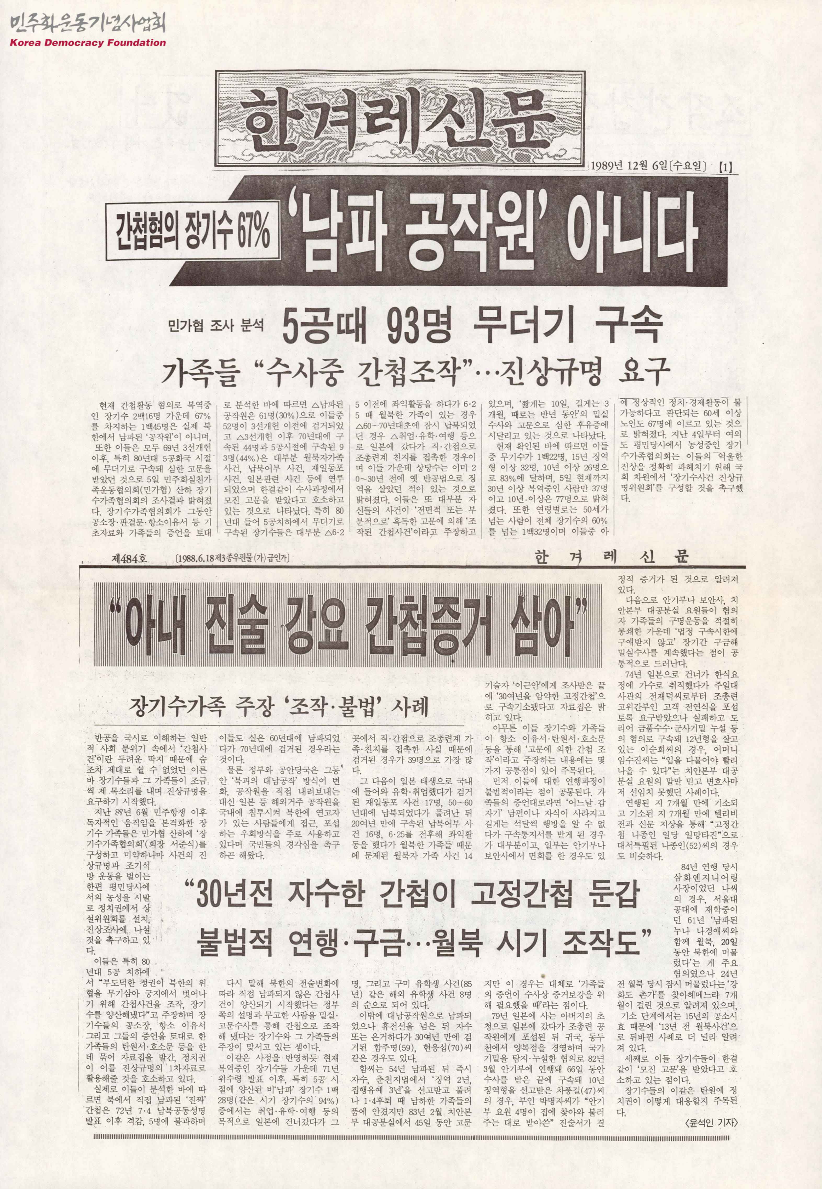 - 간첩혐의 장기수들 중 67%가 '남파 공작원'이 아니라는 기사, 장기수의 가족이 주장하는 간첩조작과 불법 사례에 대한 기사, 조작간첩 진상규명 없이 5공 청산도 없다는 글 등이 수록된 신문스크랩 모음
