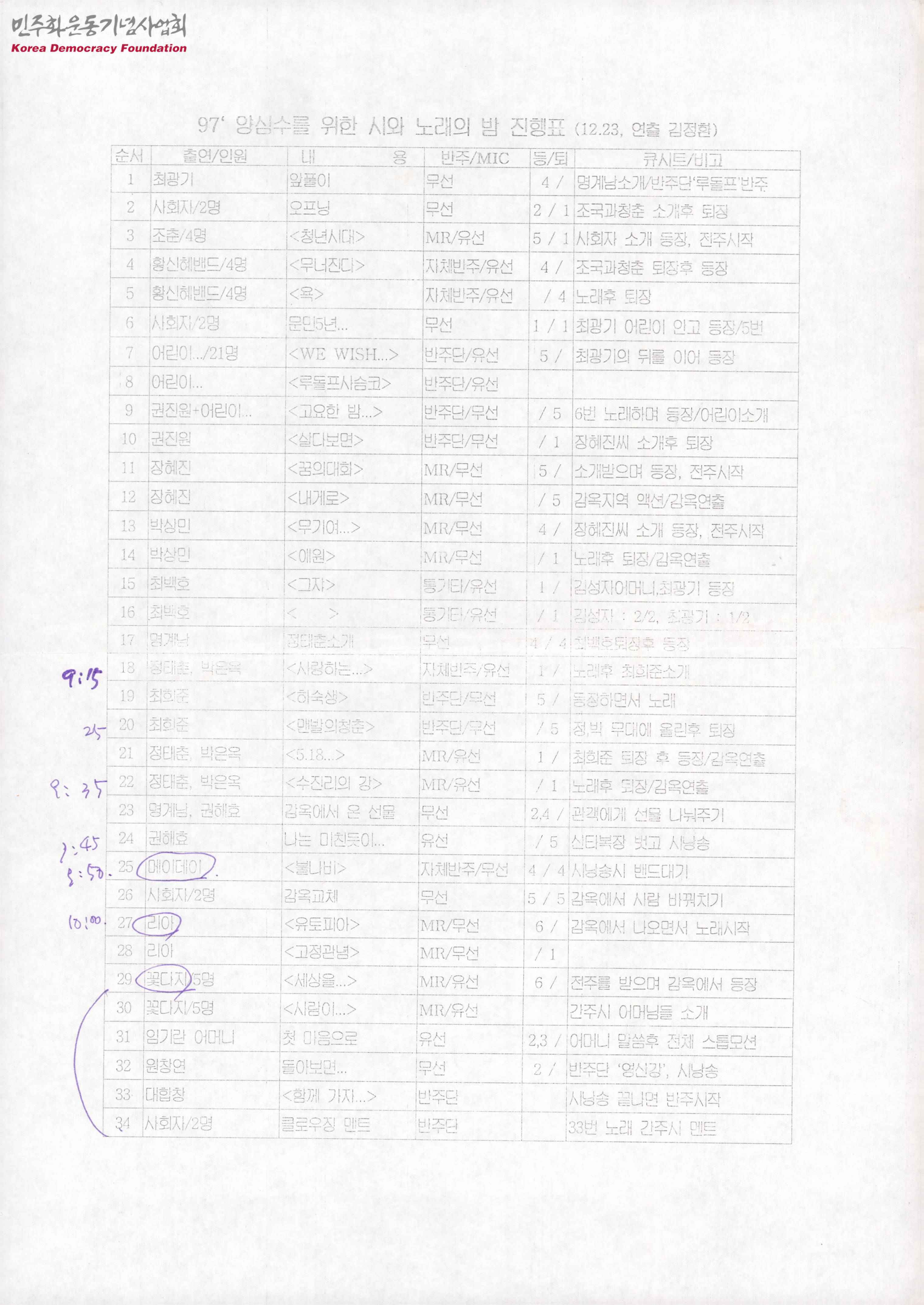 - 1997년 진행되는 양심수를 위한 시와 노래의 밤 진행표로 출연 인원과 내용, 반주와 마이크 여부 등이 적혀있고 무대 구성안이 첨부되어 있음