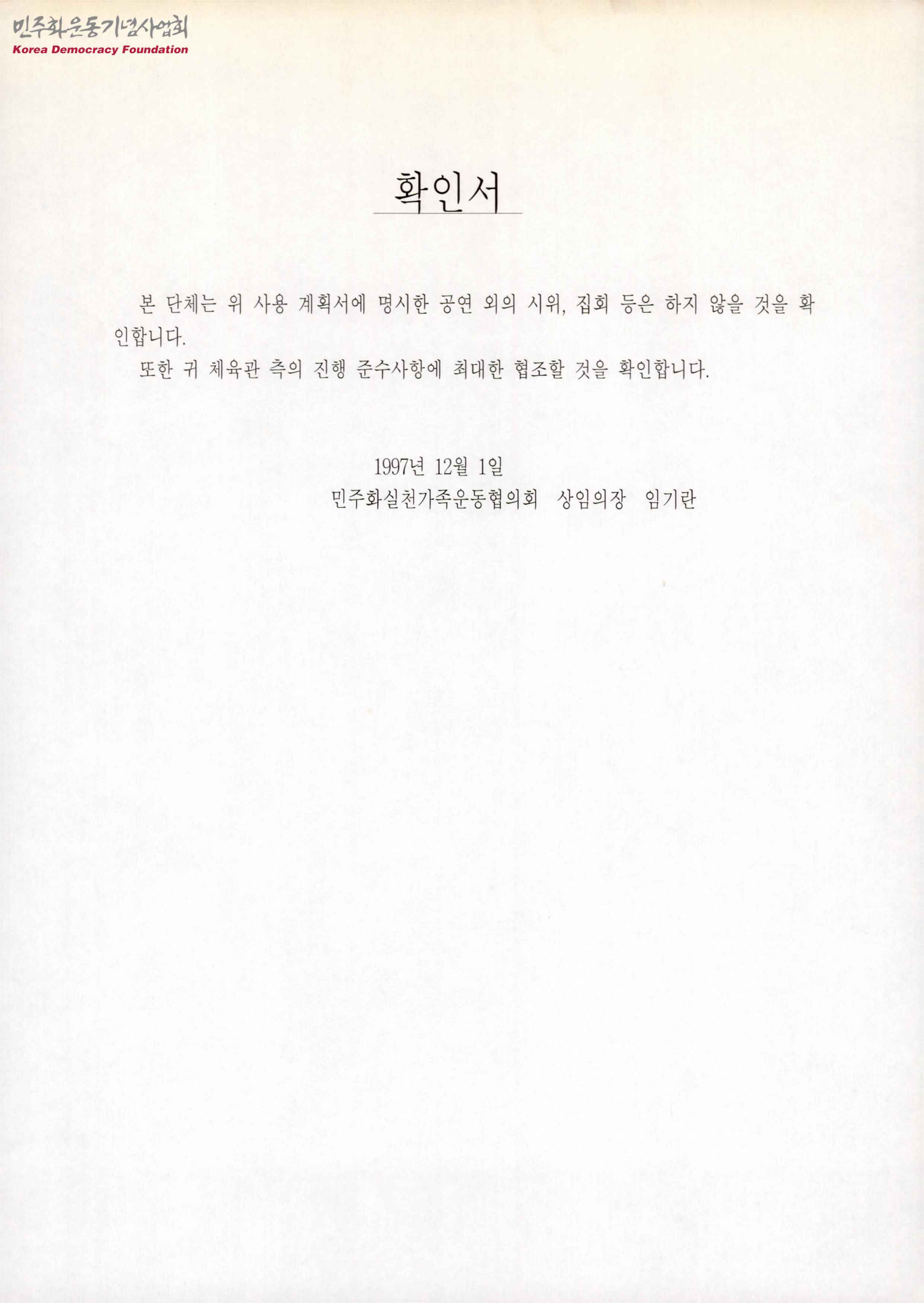 - 민주화실천가족운동협의회가 사용계획서에 명시한 공연 외의 시위나 집회 등을 하지 않을 것이며 체육관의 진행 준수사항에 최대한 협조할 것이라 적힌 확인서