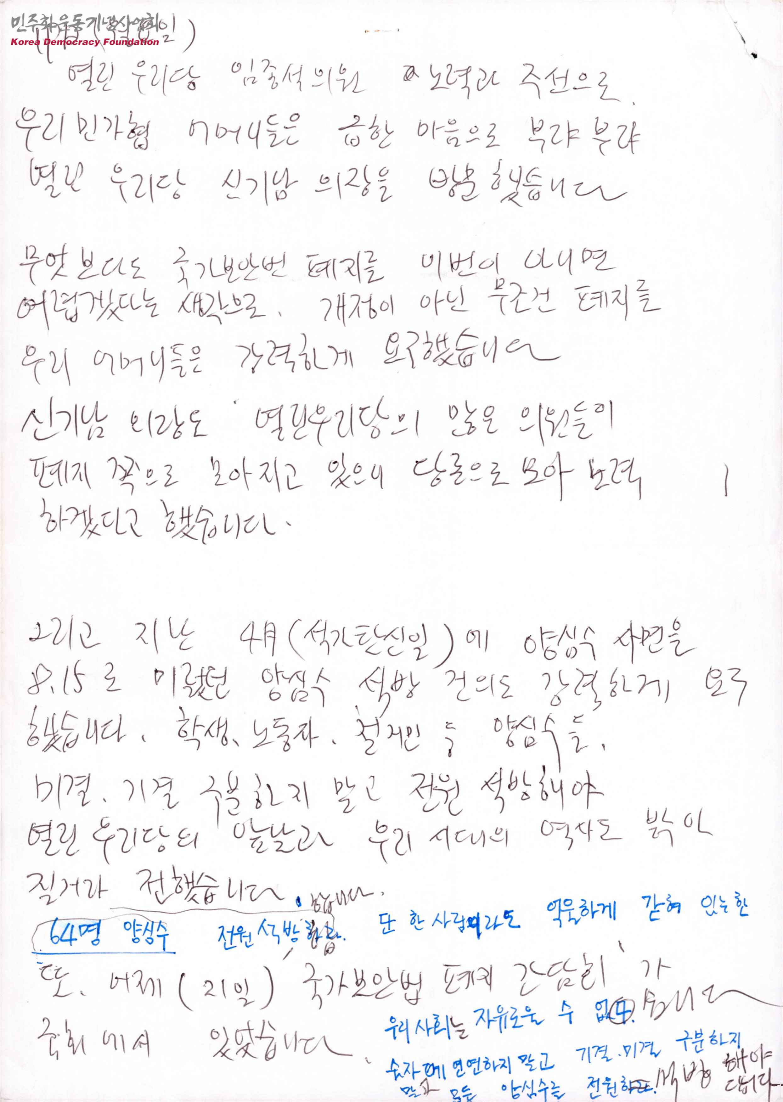 - 2004년 진행한 목요집회에서 진행한 조순덕 상임의장의 여는말 원고로 열린우리당 신기남 의장을 만나 국가보안법 폐지를 강력하게 요구했다는 것, 미뤘던 양심수 석방 건의를 강력하게 요구했다는 것 등이 적혀있음