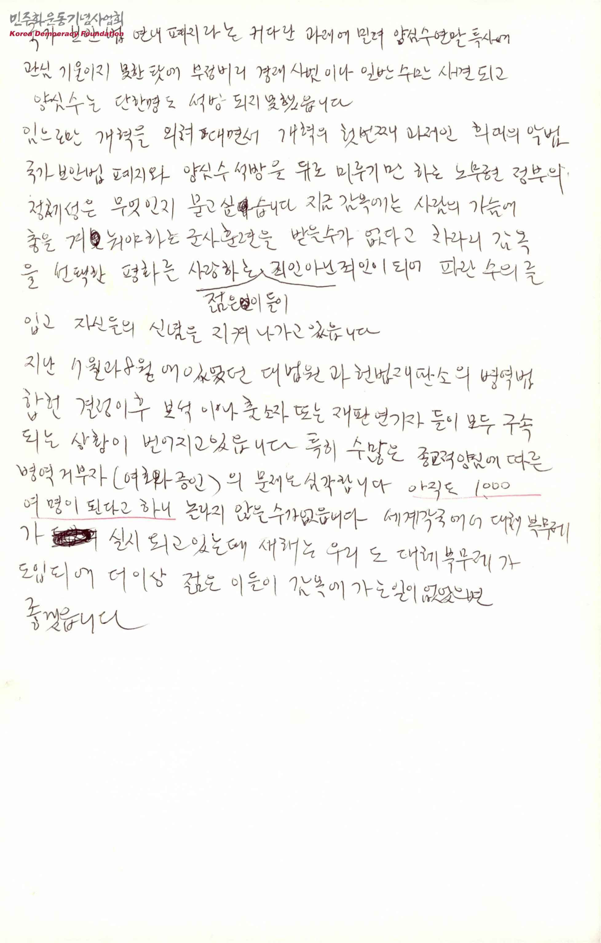 - 국가보안법에 관심을 기울였더니 부정비리 경제사범이나 일반수만 사면되고 양심수가 단 한명도 석방되지 못했다고 하며 노무현 정부를 비판하는 내용, 양심적 병역 거부자들을 위해 대체 복무제가 도입되어야 된다는 내용 등이 적힌 문서