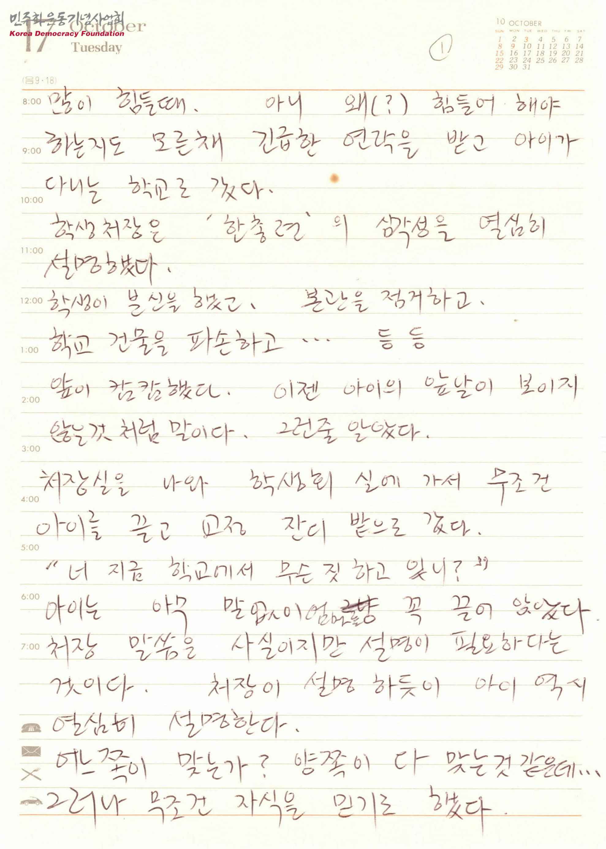 - 조순덕이 민주화실천가족운동협의회의 일원이 되었던 계기가 적혀있는 문서로 아들이 한총련 활동을 하다 수배가 된 내용, 아들의 편지를 받고 목요집회에 참석했다가 다른 어머니들과 함께 '보랏빛 수건'을 머리에 동여매었다는 것, 양심적 병역거부자, 비정규직 노동자, 외국인 노동자 등 이 모든 문제가 해결되고 양심수가 전원 석방될때까지 '보랏빛 수건'을 놓지않고 투쟁할 것이라는 내용등이 적혀있음