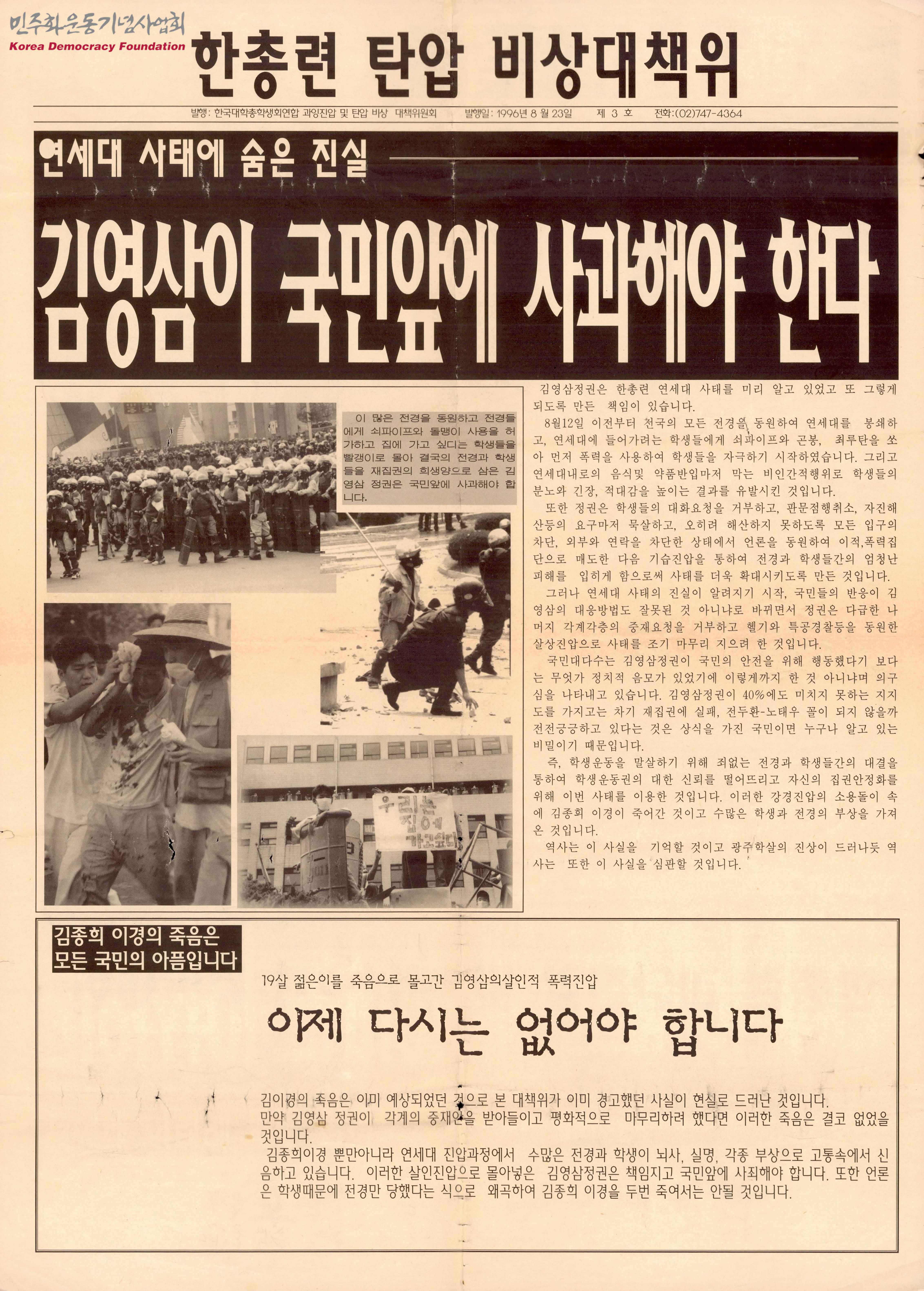 - 한총련 탄압 비상대책위 제3호 간행물로 연세대 사태에 대해 김영삼이 국민앞에 사과해야 한다는 글, 김종희 이경의 죽음은 김영삼의 살인적 폭력진압 때문이라는 글, 구속된 학생들은 전원 석방되어야 된다는 글 등이 수록됨