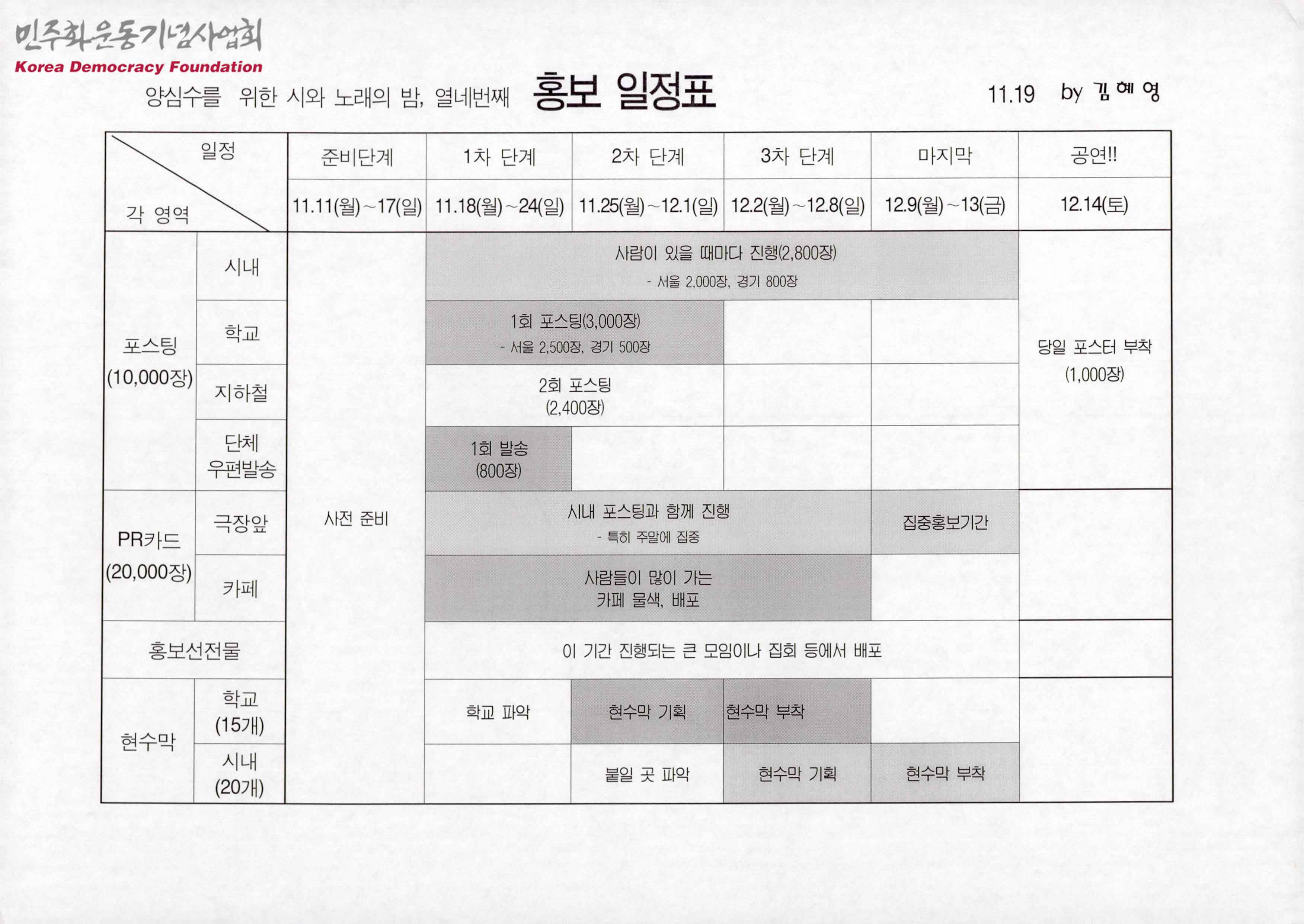 - 제14회 양심수를 위한 시와 노래의 밤 홍보일정표와 시내포스팅 진행표로 일자별 홍보 내용, 지역별 포스팅 현황 등이 적혀있음