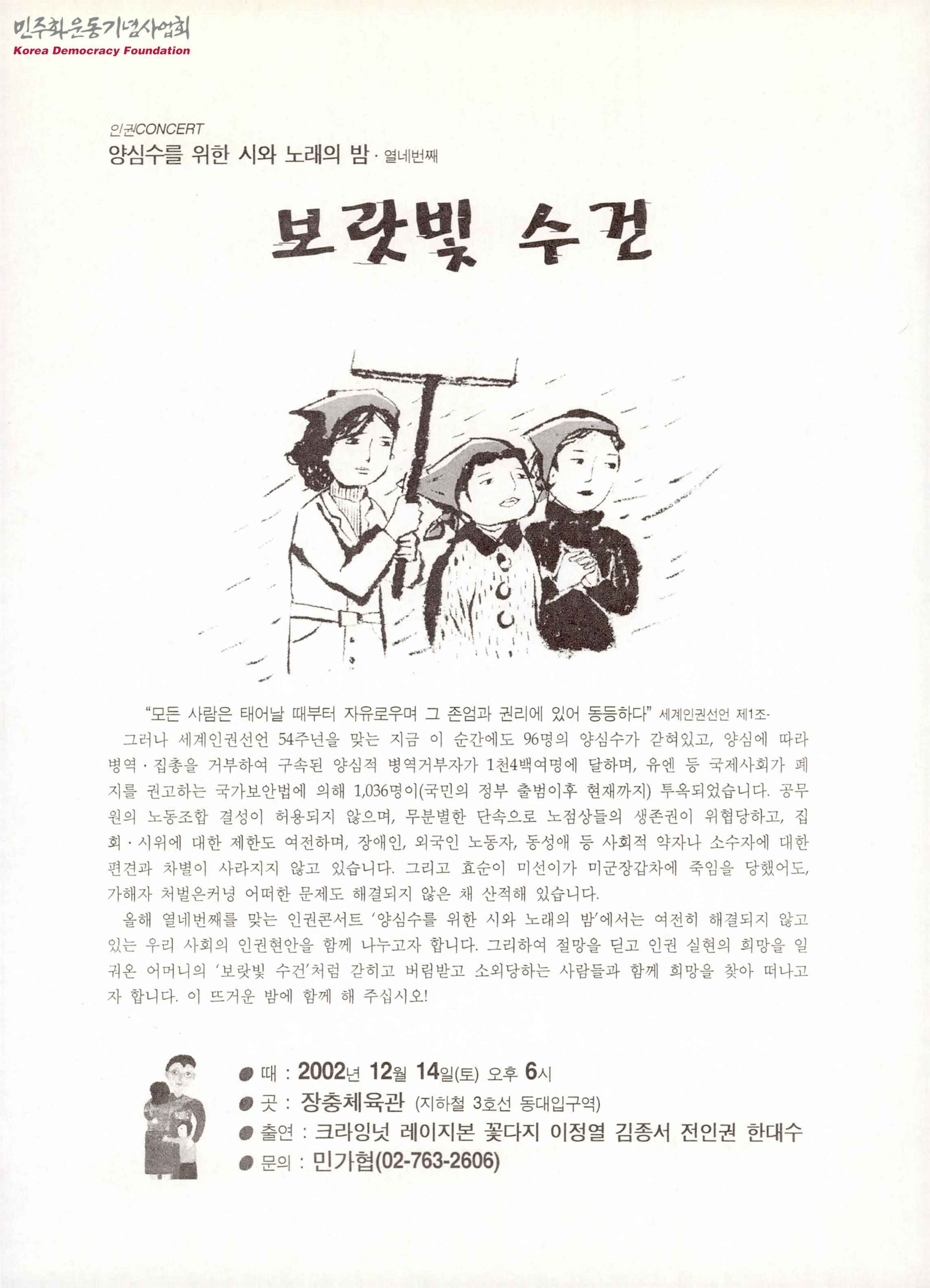 - 열네번째 양심수를 위한 시와 노래의 밤 홍보 유인물로 세계인권 선언 1조를 인용한 초대 글, 행사의 일시와 장소 등이 적힌 글, '어머니의 보랏빛 수건으로 인권을 노래하라!' 라는 초대 글 등이 수록됨
