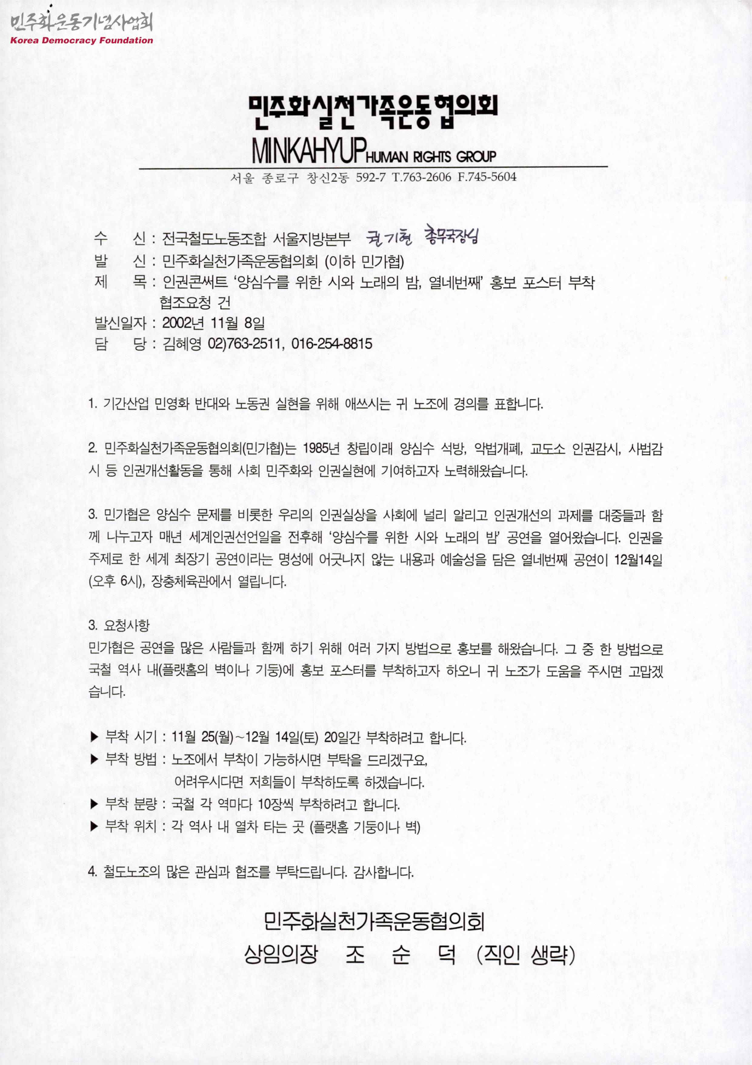 - 철도노조에게 보낸 민주화실천가족운동협의회에 대한 소개와 공연에 대한 소개, 공연개요, 요청사항, 포스터 부착 방법등이 적혀있는 문서