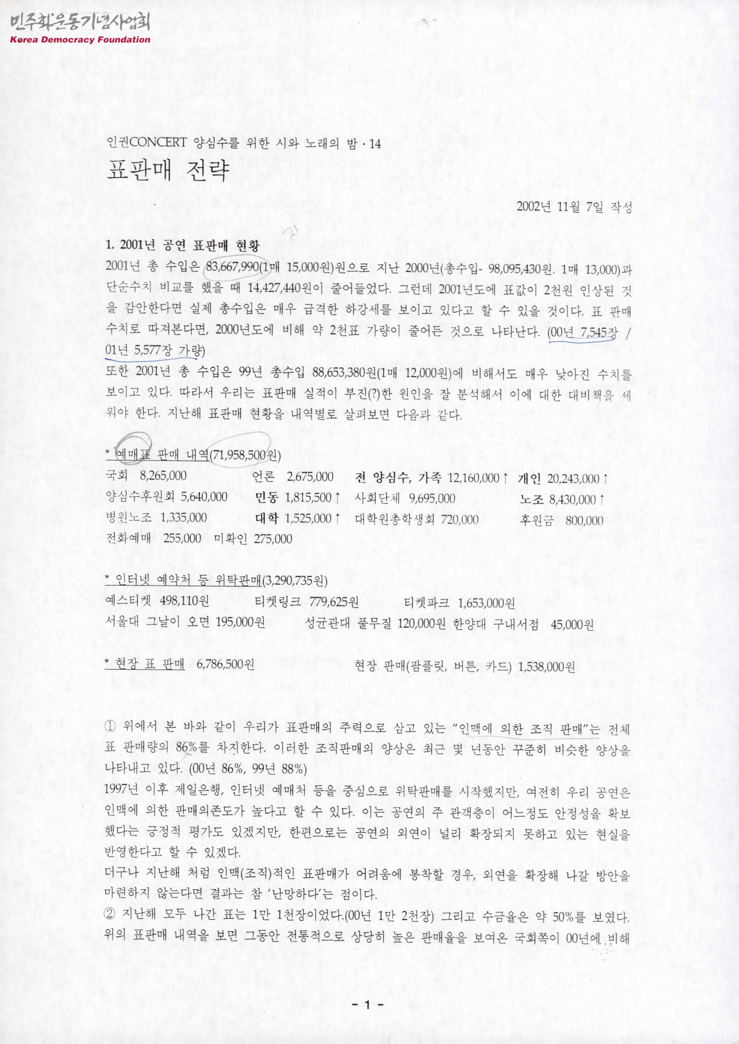 - 열네번째 양심수를 위한 시와 노래의 밤 표판매 전략이 적힌 문서로 목차는 다음과 같음 1. 2001년 공연 표판매 현황 2. 2002년 표판매 전략에 대해 3. 표판매 일정 4. 역할분담