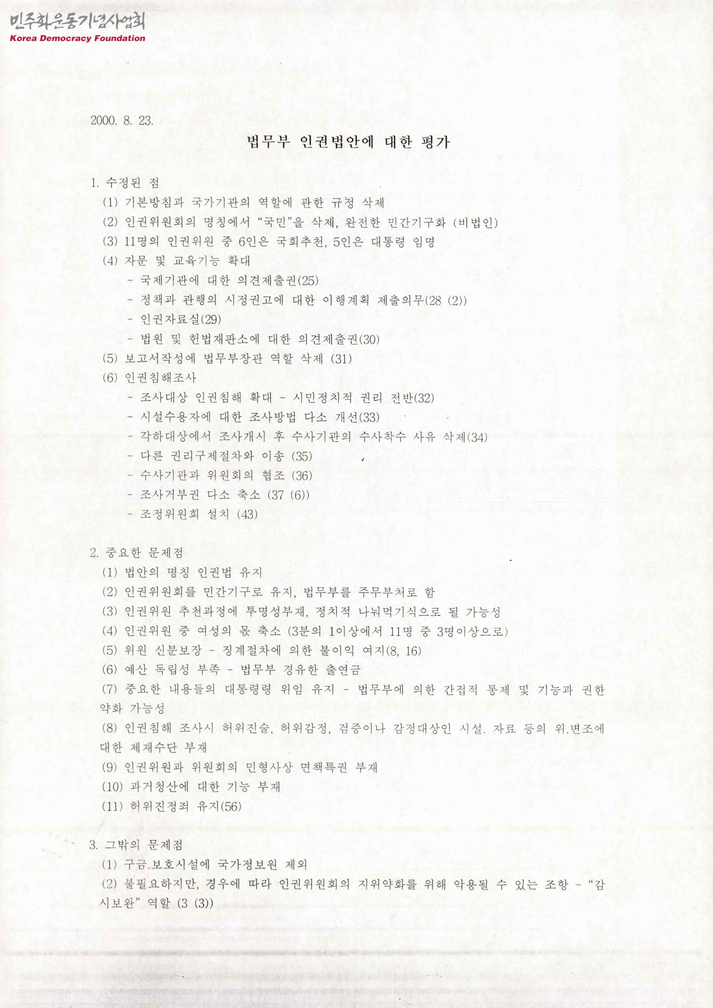 - 2000년 8월 23일 작성된 법무부 인권법안에 대한 평가서로 '기본방침과 국가기관의 역할에 과한 규정 삭제 등의 수정된 점', '법안의 명칭 인권법 유지 등의 중요한 문제점', '구금·보호시설에 국가정보원 제외 등의 그밖의 문제점' 등의 내용이 수록됨