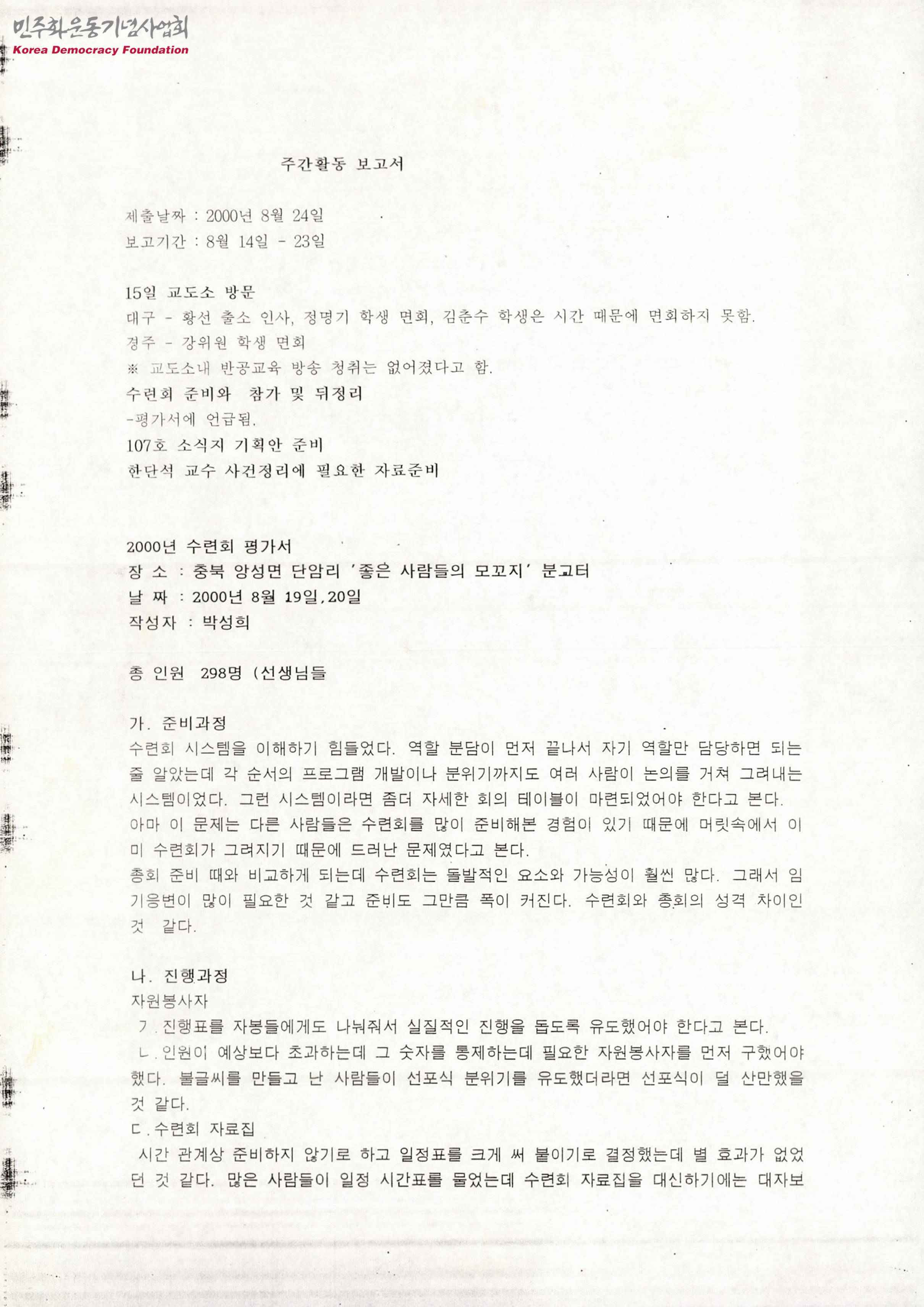- 2000년 8월 14일부터 8월 23일까지 박성희의 주간활동 보고서로 '8월 15일 교도소 방문', '수련회 준비와 참가 및 뒷정리', '2000년 수련회 평가서' 등의 내용이 수록됨