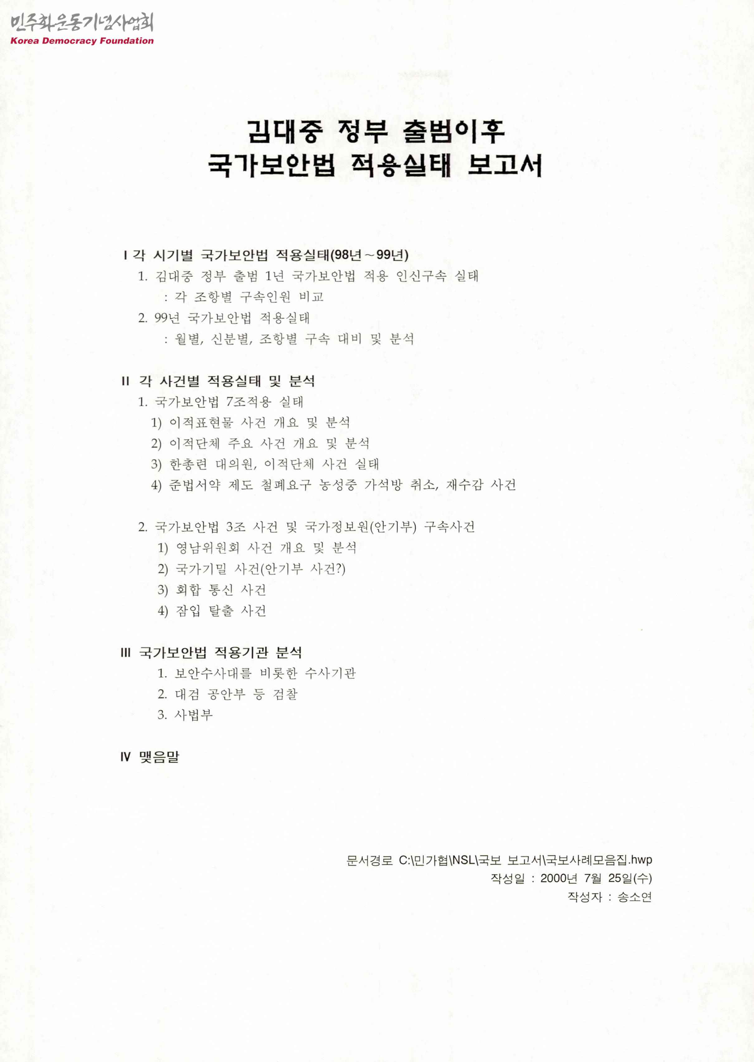 - 2000년 7월 25일 민주화실천가족운동협의회의 송소연이 작성한 김대중 정부의 국가보안법 적용실태 보고서로 '각 시기별 국가보안법 적용실태(98년~99년)', '각 사건별 적용실태 및 분석', '국가보안법 적용기관 분석' 등의 내용이 수록됨