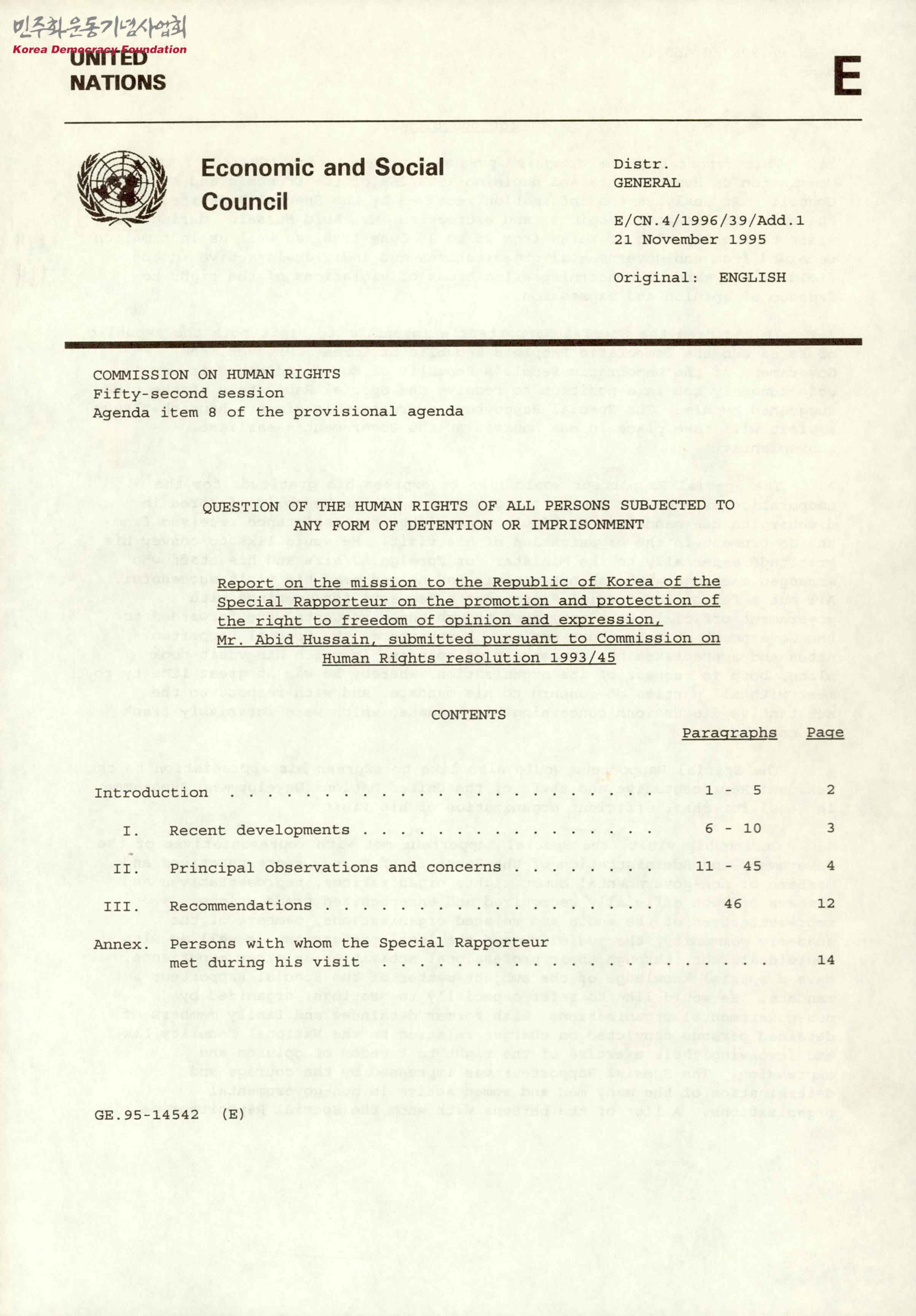 - 국제 연합 경제 사회 이사회에서 발표한 인권위원회 임시 안건 제52차 회의 제8항 '모든 형태의 구금 대상자의 인권에 대한 질문'으로 의견·표현의 자유권 증진 및 보호에 관한 특별보고관의 대한민국 임무보고서가 수록되어 있으며, '최근의 동향', '주요 관찰과 관심사' 등의 내용이 수록됨