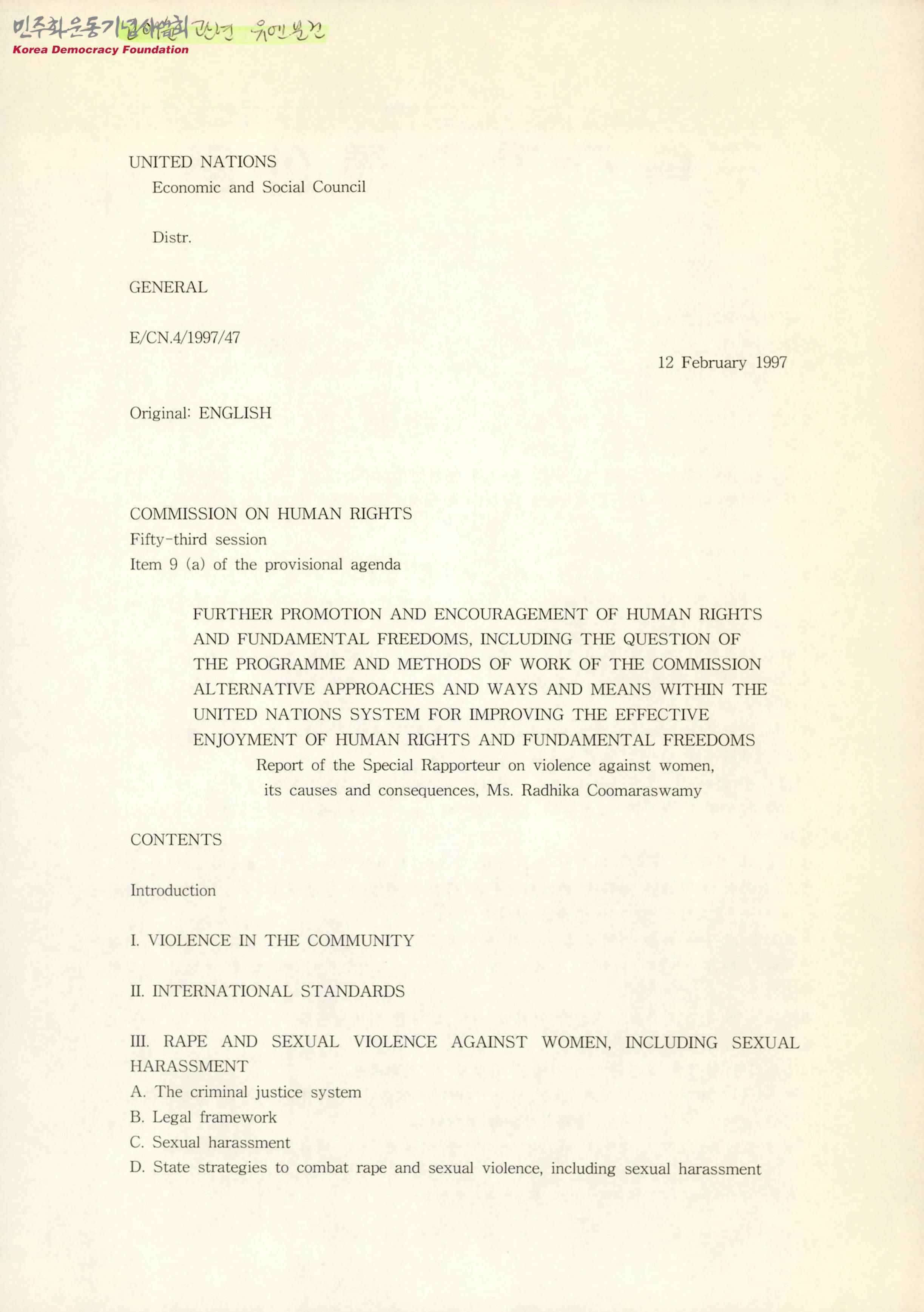 [Commission of Human Rights Fifty-third session Item 9 (a) of the provisional agenda(인권위원회 임시 안건제53차 회의 제9항)]