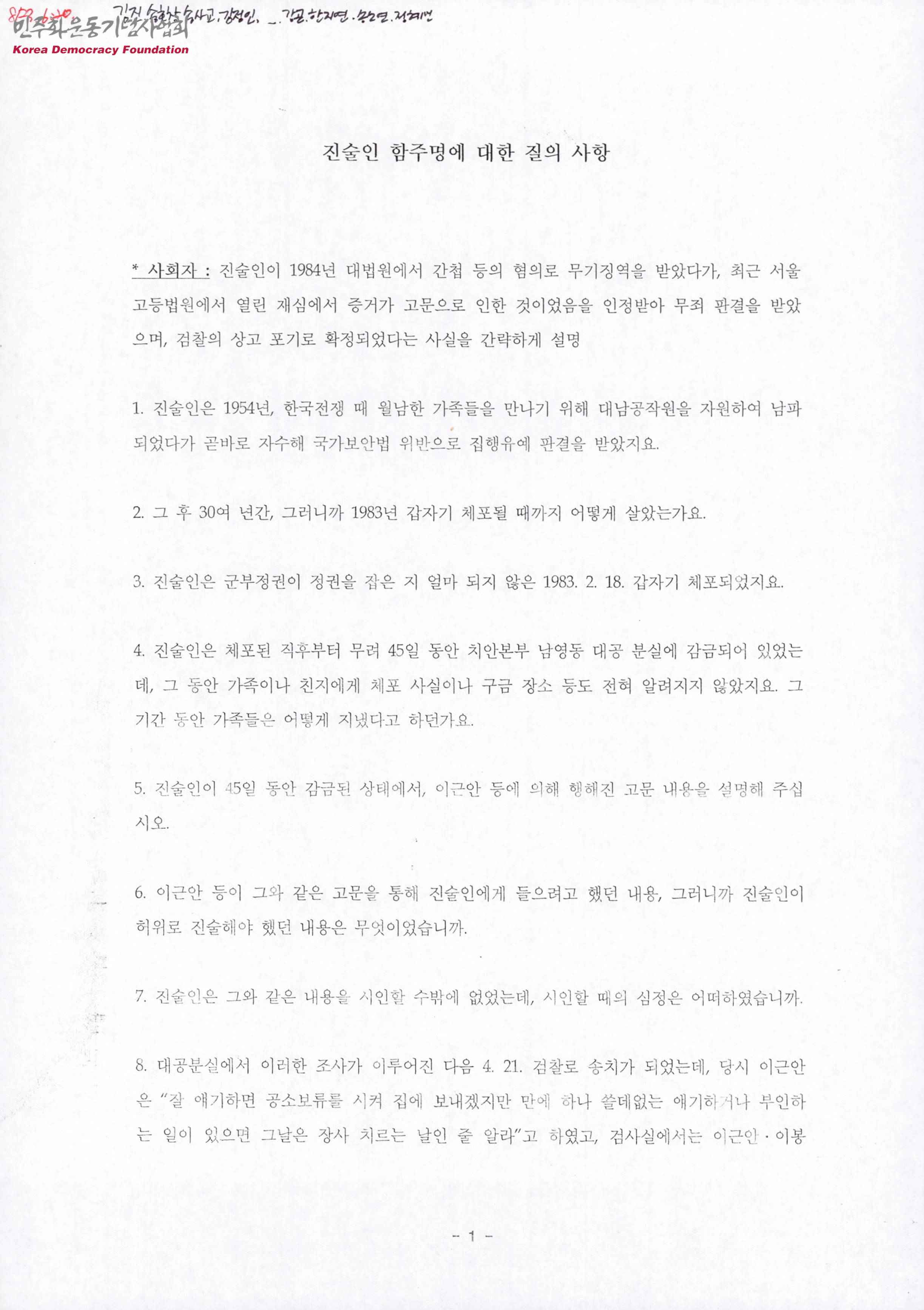 - 간첩 등의 혐의로 무기징역을 받았다가 재심에서 고문에 의한 허위자백을 인정받아 무죄판결을 받은 함주명에게 물어볼 질문 사항이 적힌 문서
