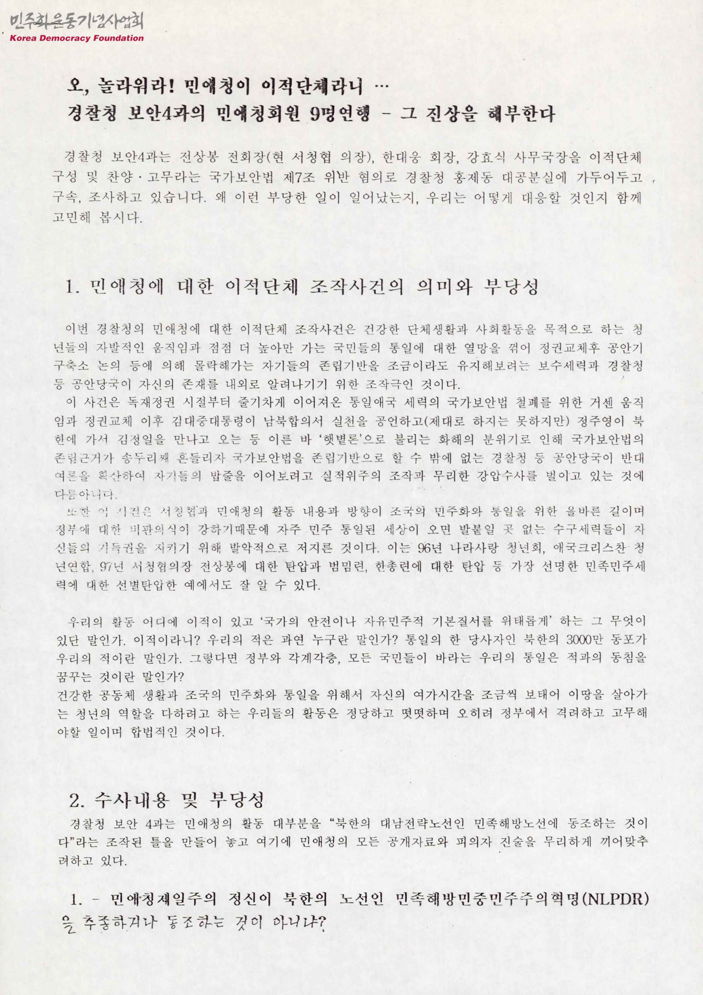 - 전상봉과 한대웅 등 서울민주청년단체협의회와 민족통일애국청년회 회원들에 대한 탄압이 왜 일어났는지와 어떻게 대응할 지에 대해 적은 문서로 목차는 다음과 같음 1. 민애청에 대한 이적단체 조작사건의 의미와 부당성 2. 수사내용 및 부당성 3.; 수사과정에서 나타난 문제점과 비민주성 4. 우리의 대응(이야기해 봅시다)