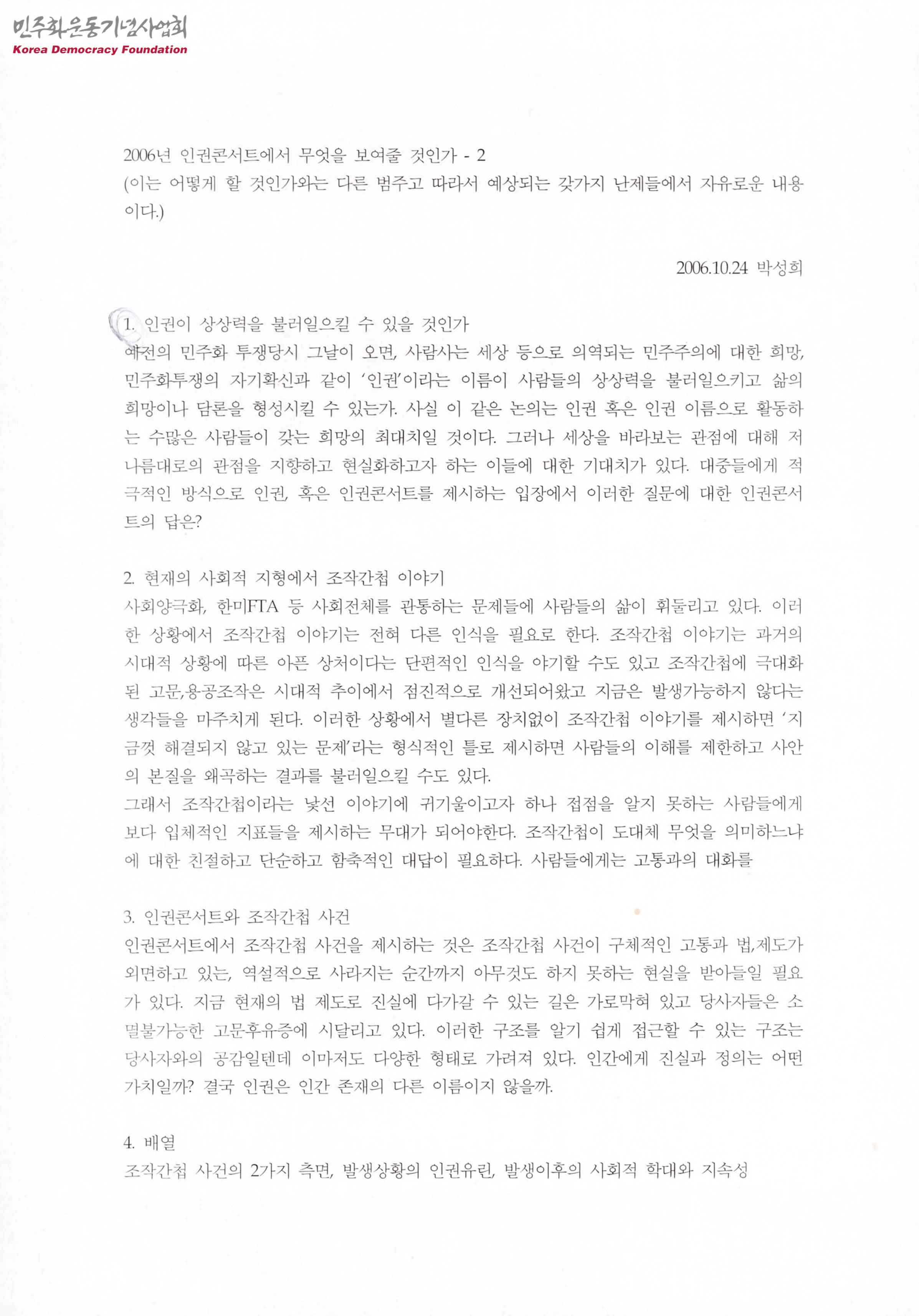 - 열여덟번째 인권콘서트에 어떤 내용을 담을 것인지에 대해 적은 문서로 내용은 다음과 같음 1, 인권이 상상력을 불러일으킬 수 있을 것인가 2. 현재의 사회적 지형에서 조작간첩 이야기 3. 인권콘서트와 조작간첩 사건 4. 배열 5. 배열