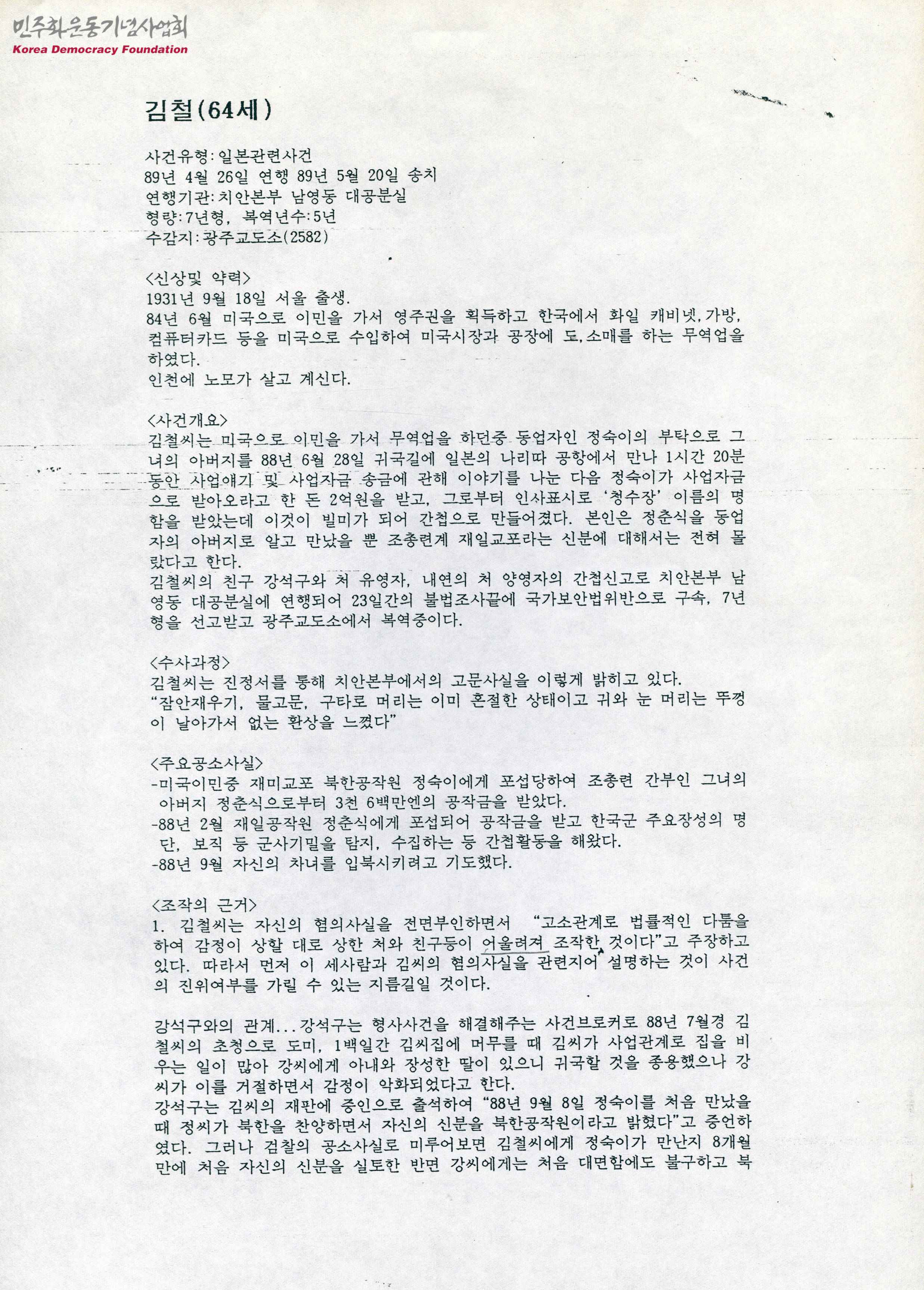 - 일본관련사건으로 구속된 김철에 대한 문서로, 미국 이민생활 도중 동업자인 정숙이의 부탁으로 그녀의 아버지로부터 사업자금 2억원을 받고 그로부터 인사표시로 '청수장' 이름의 명함을 받은 것을 빌미로 간첩으로 만들어졌다는 것, 친구 강석구 등의 신고로 남영동 대공분실에 연행되어 23일간의 불법조사 끝에 국가보안법으로 구속되었다는 것 등의 내용을 포함하고 있음