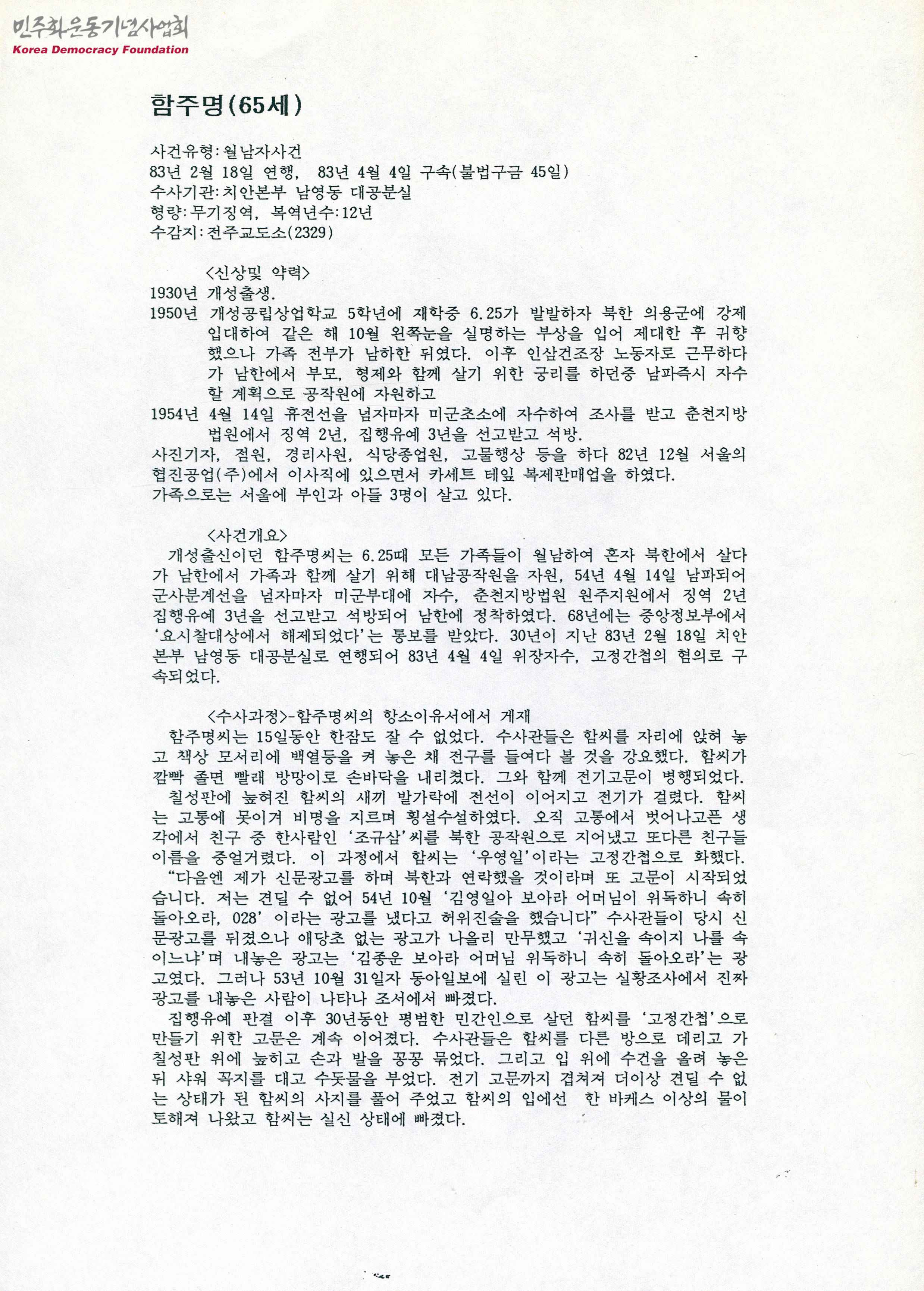 - 월남자사건으로 구속된 함주명에 대한 문서로, 6.25때 월남한 가족들과 함께 살기위해 대남공작원을 자원해 남파되었다는 것, 군사분계선을 넘자마자 미군부대에 자수해 남한에 정착했다는 것, 83년 2월경 남영동 대공분실로 연행되어 위장자수 및 고정간첩의 혐의로 구속되었다는 것 등의 내용을 포함하고 있음