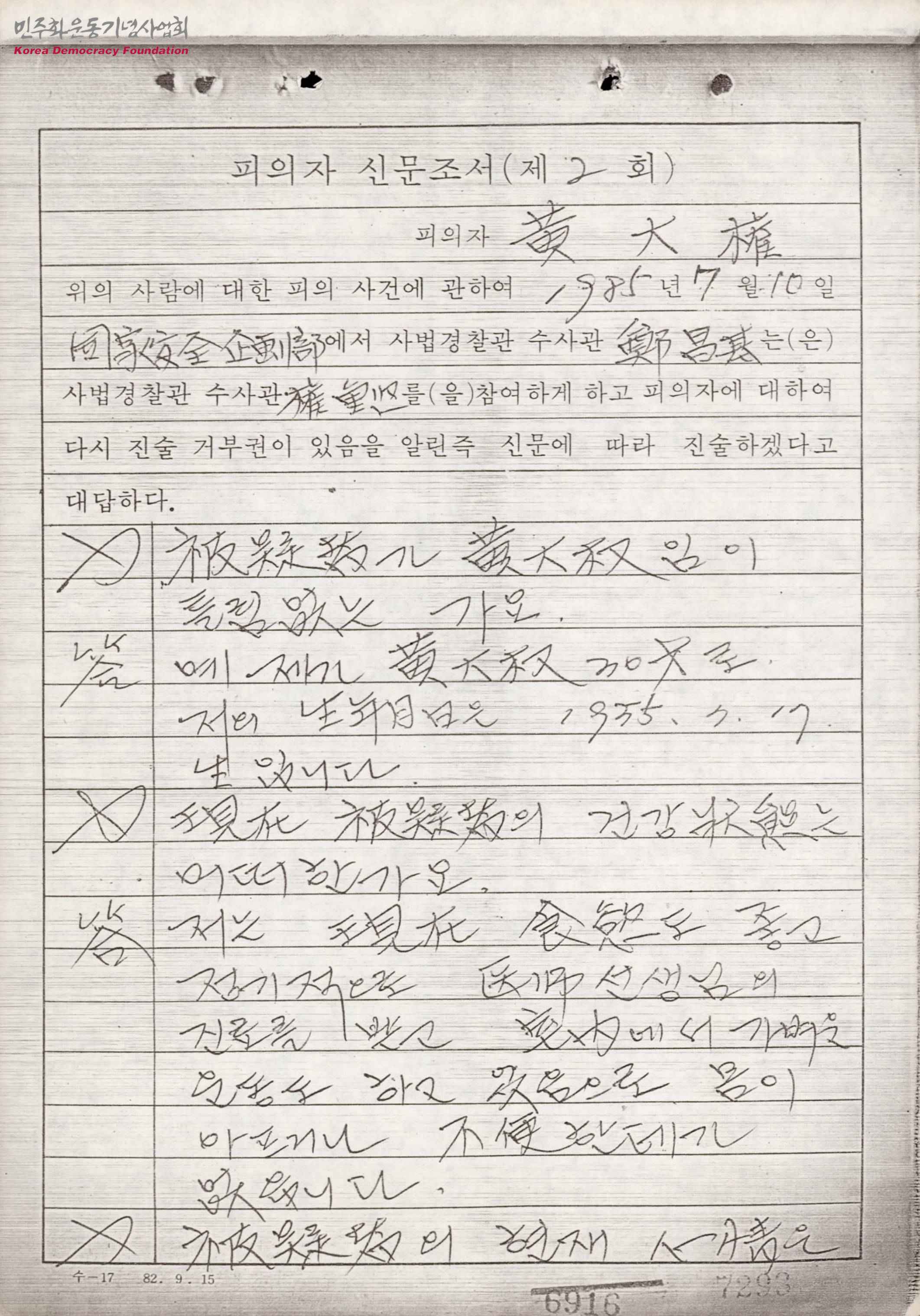 - 간첩으로 국내에 잠입하여 대학교에 침투한 혐의로 구속된 황대권에 대한 국가안전기획부의 신문내용으로, '피의자가 황대권임이 틀림없는가요', '현재 피의자의 건강 상태는 어떠한 가요', '피의자의 현재 심정은 어떠한 가요' 등의 내용에 대한 황대권의 답변이 수록되어 있음