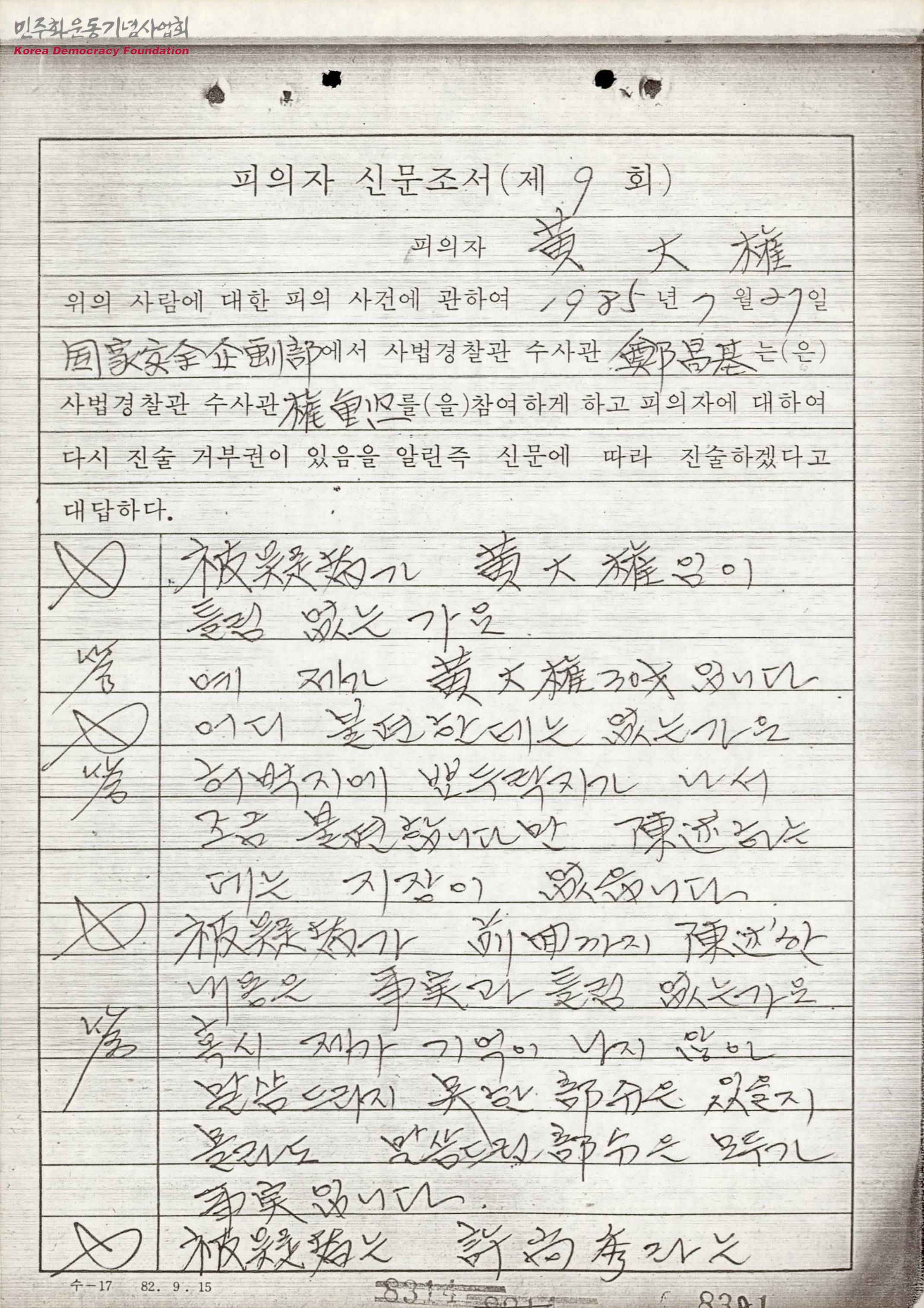 피의자신문조서 제9회 [황대권 국가보안법 위반 등 사건 관련]
