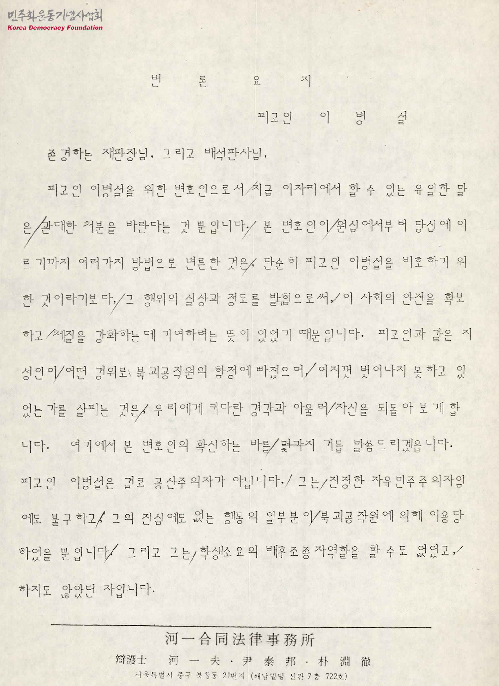 [1987년 5월 16일 서울고등법원 제2형사부로 보낸 이병설의 변론요지서 초안]