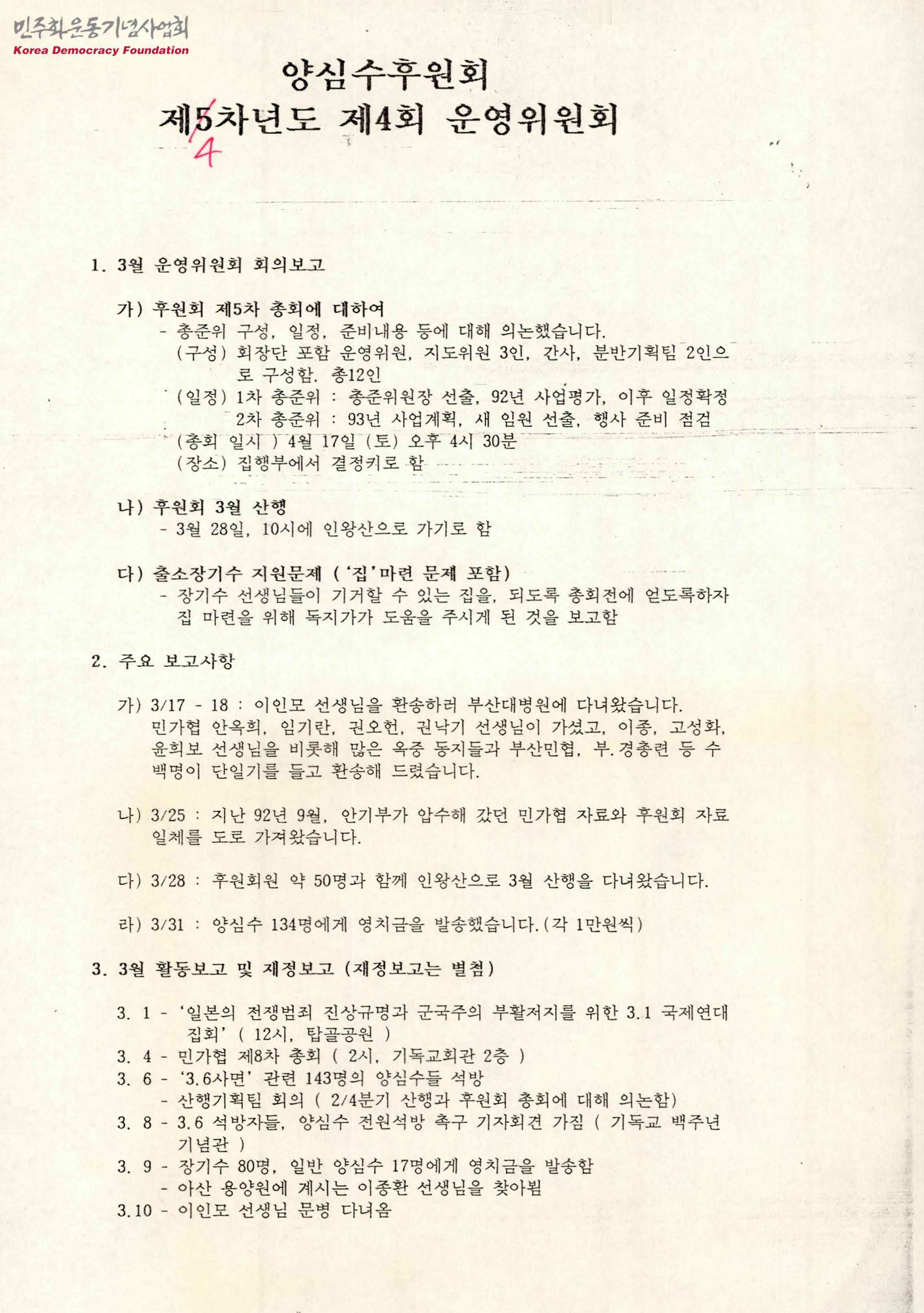 [민주화실천가족운동협의회 양심수후원회 제4차년도 제4회 운영위원회 회의록]