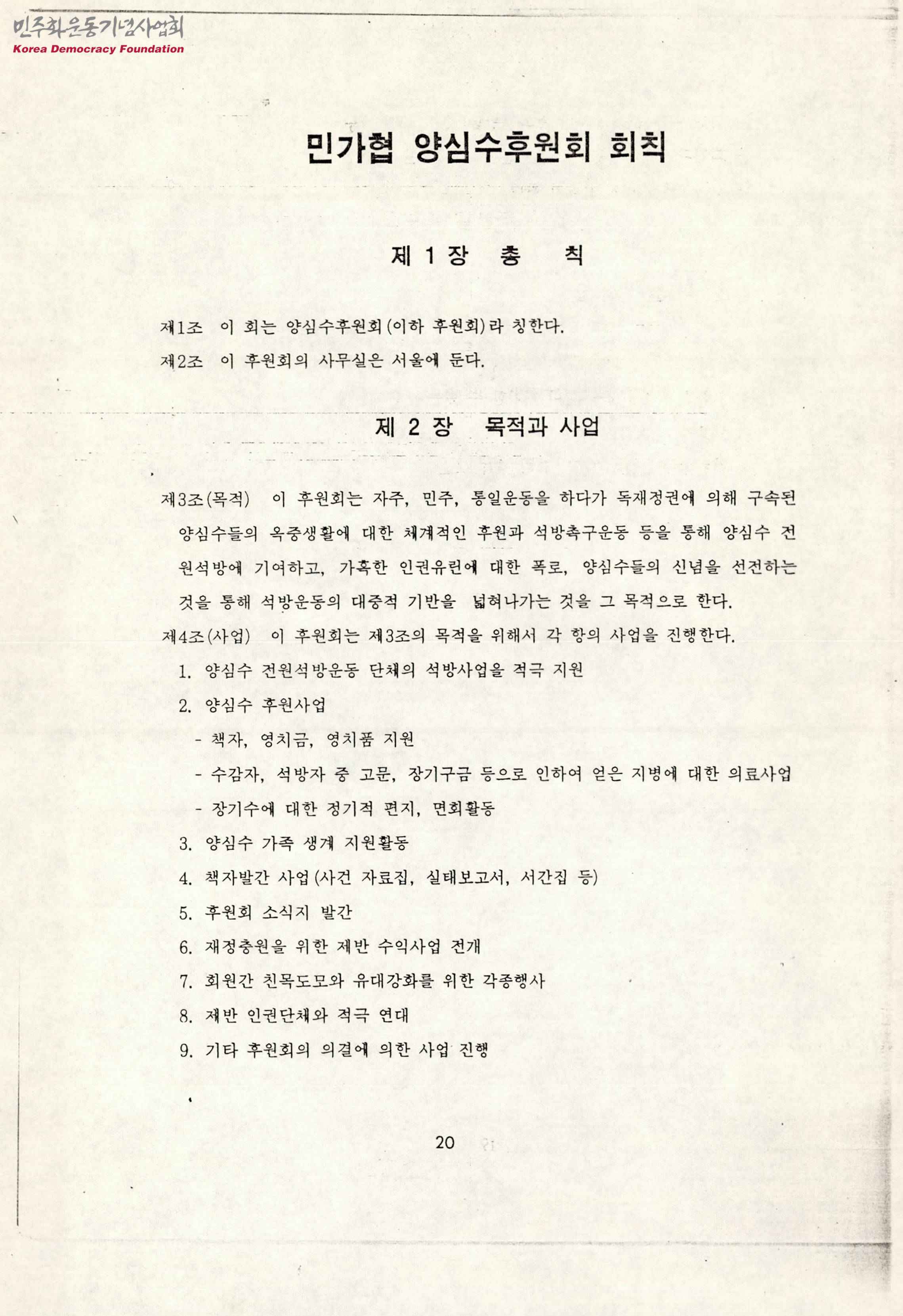 - 민주화실천가족운동협의회 양심수후원회의 회칙을 담은 문서로 '제1장 총칙', '제2장 목적과 사업', '제3장 회원', '제4장 기관 및 임원', '제5장 재정 및 감사', '제6장 규약의 개정 및 준용', '부칙' 등의 내용이 수록되어 있음